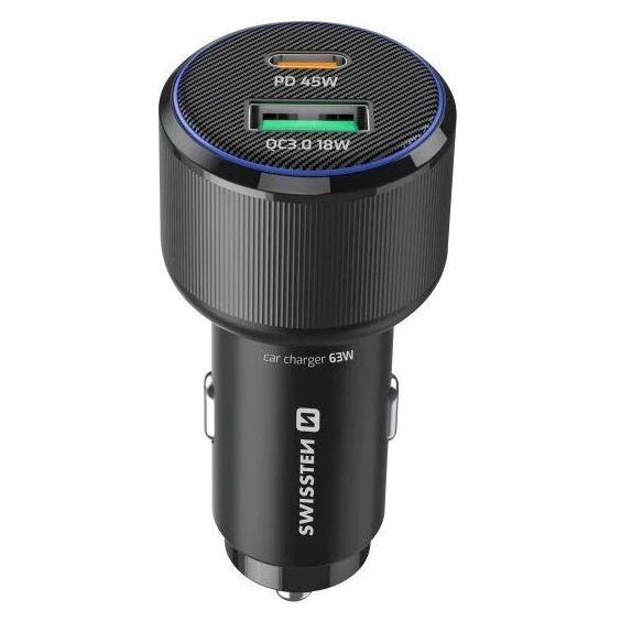 Swissten ładowarka samochodowa z obsługą PD 3.0 i QC 3.0 oferuje wysoką moc do 63W i jest idealna do ładowania laptopów, tabletów i smartfonów. Dzięki portowi USB-C o mocy do 45W z łatwością zasila nawet wymagające urządzenia, podczas gdy port USB-A zapewnia szybkie ładowanie do 18W.