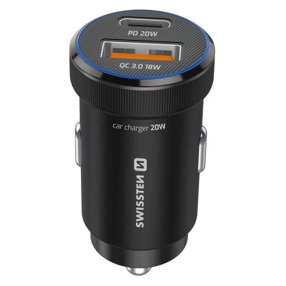 Szybka ładowarka samochodowa Swissten z USB-C (20W) i USB-A (18W) oferuje kompaktową konstrukcję, pierścień świetlny i 1-metrowy kabel USB-C do wygodnego ładowania w podróży.