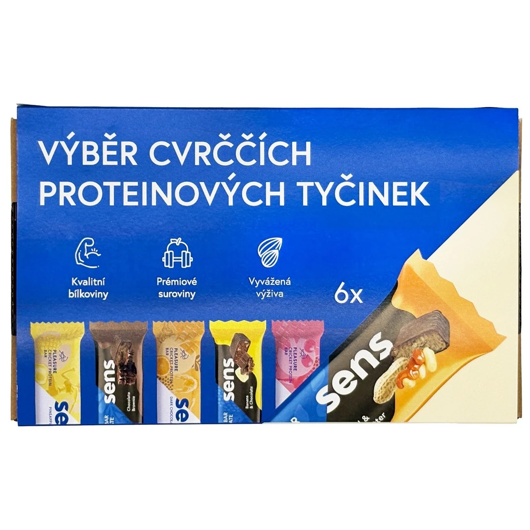 Opakowanie sześciu batonów proteinowych Sens z świerszczy, zapakowanych w pudełko prezentowe, zawiera trzy batony czekoladowe i trzy owocowe dla szybkiej energii. Batony czekoladowe znajdziesz w smakach Banan & czekolada, Karmel & masło orzechowe, Brownie czekoladowe, a owocowe w smakach Ananas & kokos, Gorzka czekolada & wiśnia, Gorzka czekolada & pomarańcza.