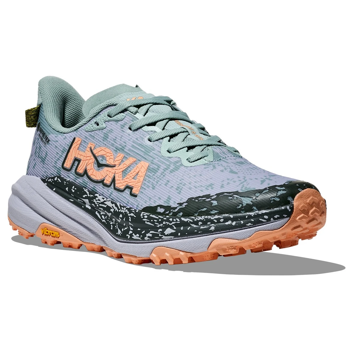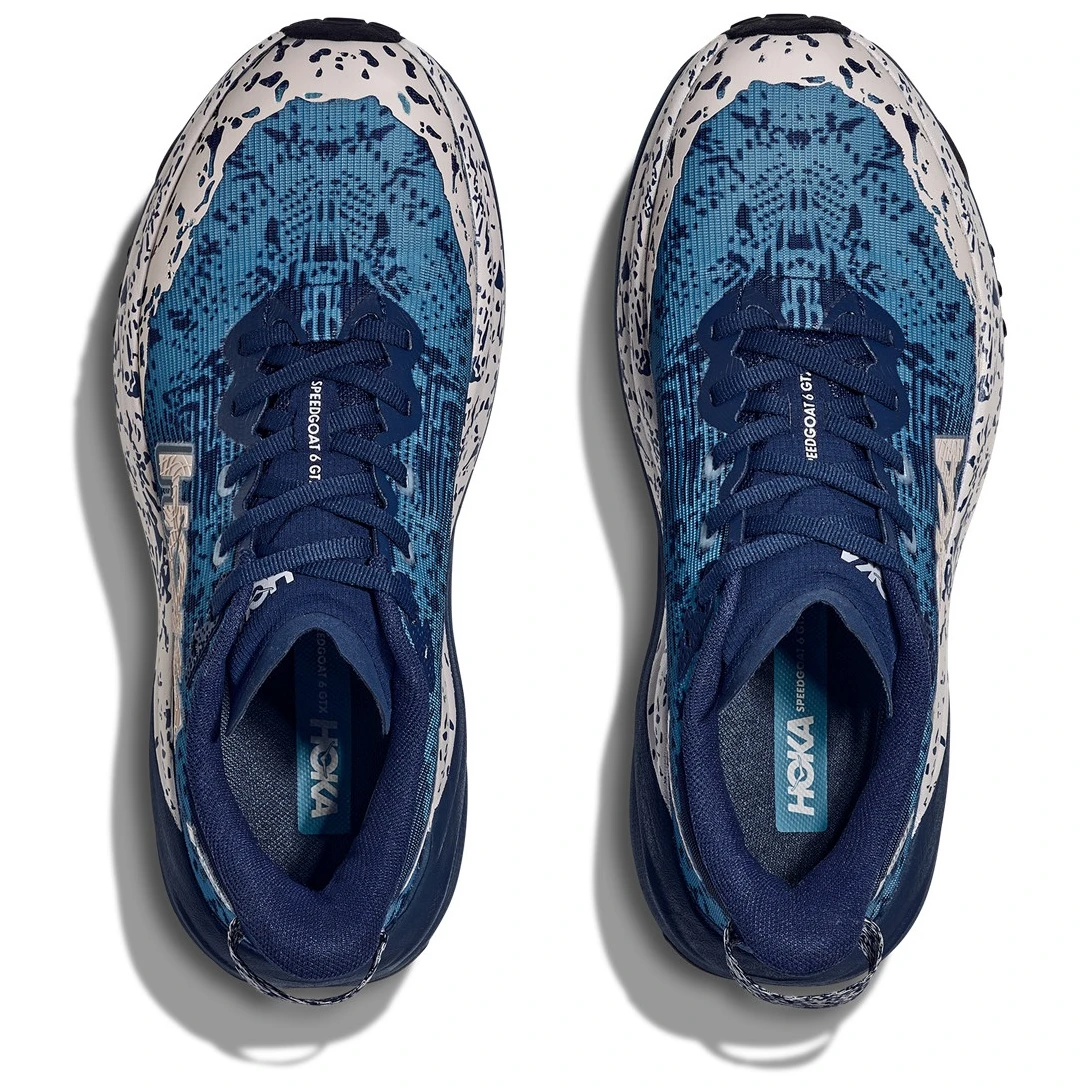 Buty do biegania Speedgoat 6 GTX firmy Hoka zostały zaprojektowane z myślą o technicznych szlakach. 6. generacja powraca z niską wagą i świetną przyczepnością. Ten but jest kontynuowany od podeszwy po sznurowadła z podeszwą środkową Vibram® Megagrip i Traction Lug dla lepszej przyczepności na luźnym podłożu. Speedgoat 6 zachowuje tę samą wysokość podeszwy i kształt rockera (krzywizna podeszwy zewnętrznej), wykorzystuje lżejszą mieszankę podeszwy środkowej i grubszą dwuwarstwową siatkę żakardową, która wzbudza zaufanie w każdym terenie .