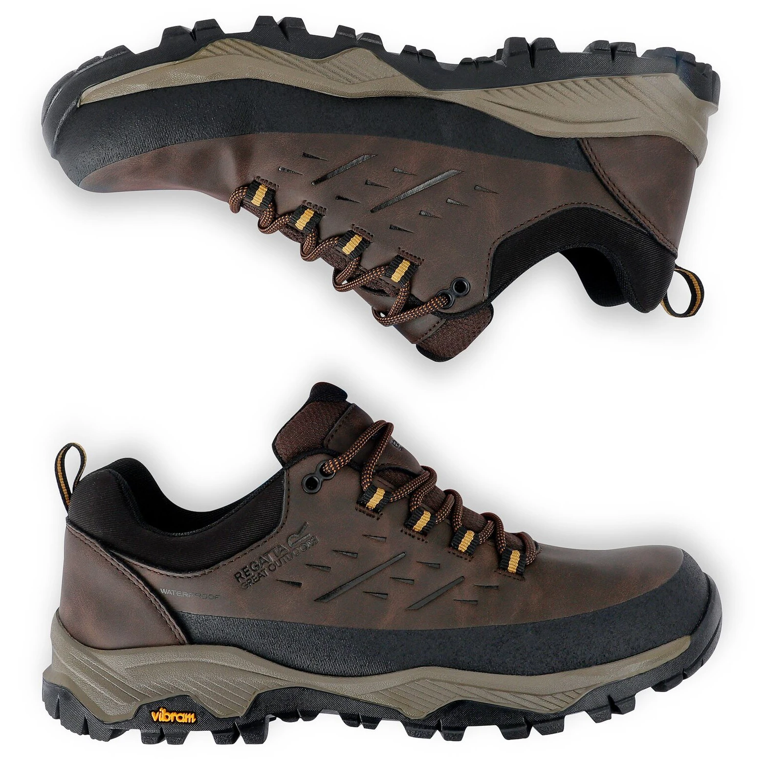 Buty męskie Blake Low marki Regatta mają cholewkę ze skóry syntetycznej i membranę ISOTEX, co zapewnia oddychającą i wodoodporną ochronę, a wkładki TECFOAM amortyzują wstrząsy. Podeszwa Vibram® zapewnia przyczepność, a zapięcie na haczyki zapewnia wygodne noszenie. Lekkie, a zarazem solidne buty zapewniają długotrwałą wydajność, komfort i wsparcie podczas outdoorowych przygód lub codziennego użytkowania.