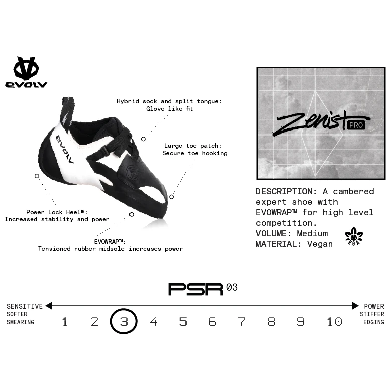 Buty wspinaczkowe Evolv Zenist Pro zostały zaprojektowane specjalnie do wspinaczki sportowej i nowoczesnego boulderingu, gdzie przeplatają się dynamiczne skoki, czułe smarowania i precyzyjna praca nóg na objętościach. Zapewniają doskonałą równowagę między wydajnością a czułością, przesuwając kategorię miękkich butów na zupełnie nowy poziom.