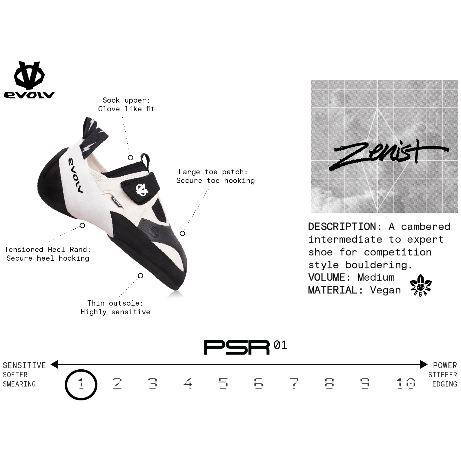 Zenist, uniwersalny model butów wspinaczkowych dla mężczyzn i kobiet, z którym nie można się pomylić. Najbardziej czułe buty wspinaczkowe marki Evolv to bezkompromisowa odpowiedź na współczesny bouldering. Jako najmiększe buty w ofercie Evolv, pozwalają wspinaczom wyczuć każdy detal pod stopami i ustawić ciało w idealnej pozycji do kolejnego ruchu.