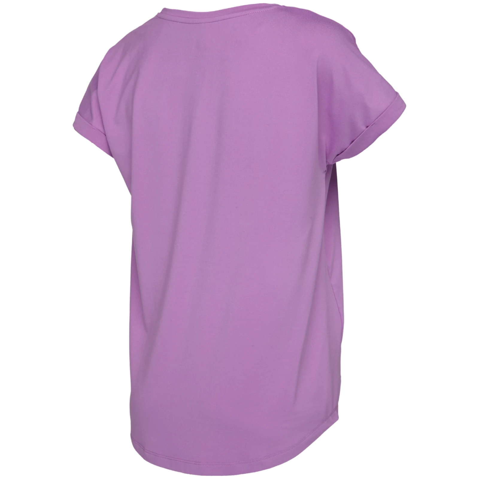 Koszulka wykonana jest z materiału pochodzącego z recyklingu, a konkretnie z połączenia poliestru i elastanu, co zapewnia lekkość, oddychalność i trwałość. Dzięki luźnemu krojowi z dekoltem w łódkę i dołem bez ściągaczy, koszulka jest odpowiednia dla każdego typu sylwetki i wygodna w noszeniu przez cały dzień.