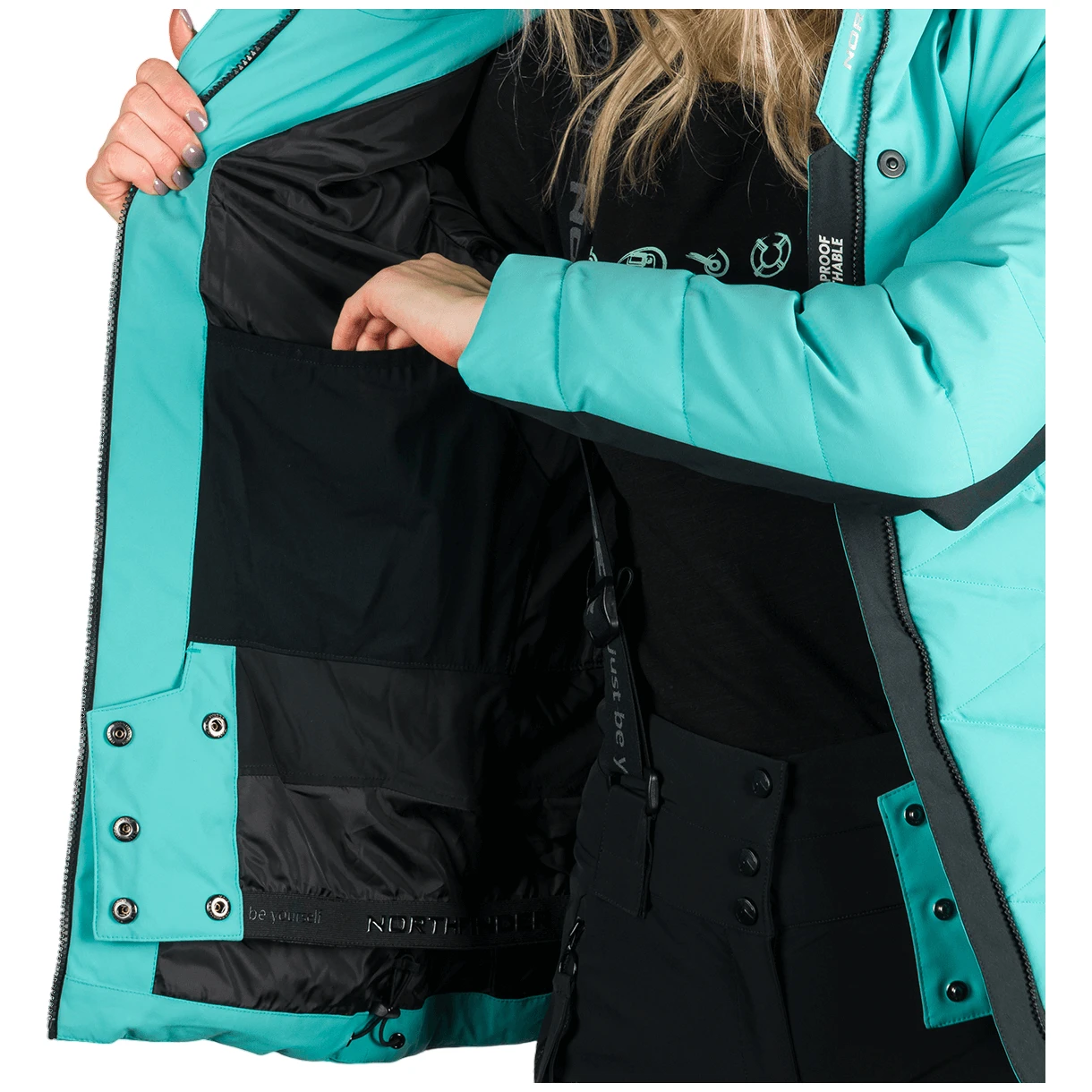 Damska kurtka narciarska Northfinder Abigayle jest doskonale przygotowana na zimową pogodę, śnieg i wiatr. Kurtka jest wykonana z wysoce elastycznego 2-warstwowego materiału z membraną o parametrach 10 000 mm H₂O / 10 000 g/m²/24 h, dzięki czemu dobrze chroni przed wiatrem i wodą, zachowując doskonałą oddychalność. Dodatkowo Materiał został potraktowany ekologiczną, hydrofobową powłoką WR (bez PFC).