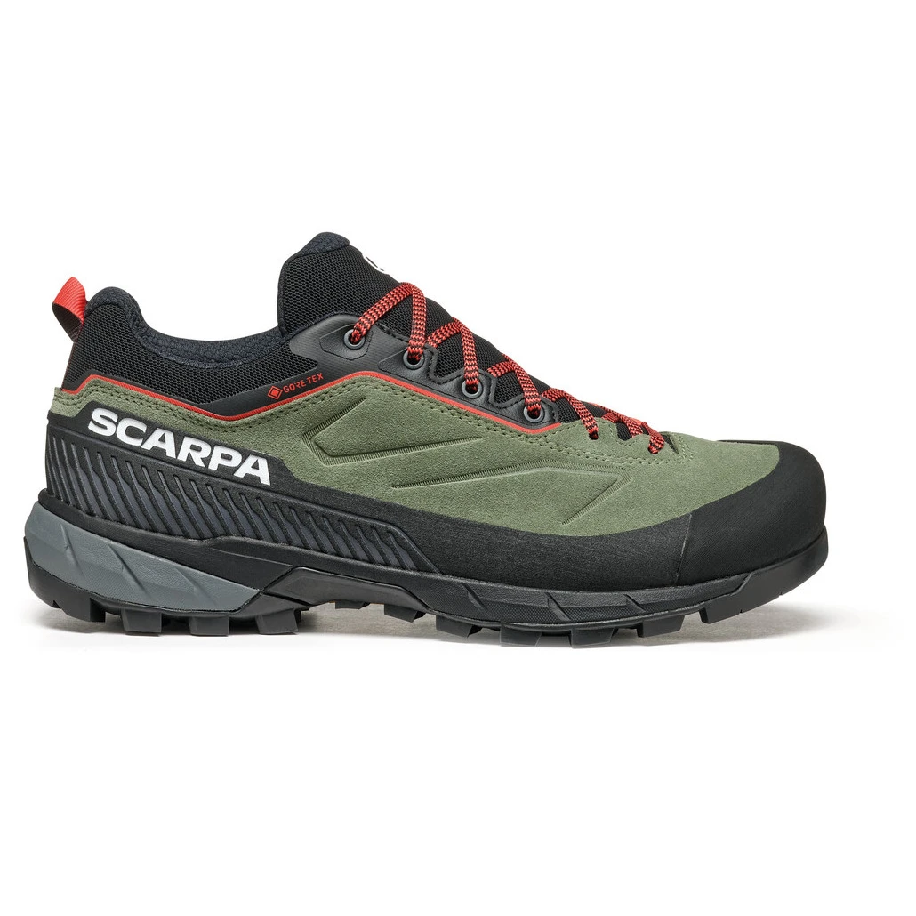 Tworzywo z wytrzymałej skóry zamszowej z wodoodporną obróbką zostało uzupełnione gumowym brzegiem, który chroni stopę przed ostrymi kamieniami. Wewnątrz kryje się wodoodporna, a jednocześnie oddychająca membrana GORE-TEX® ePE, dzięki czemu Twoje stopy zawsze pozostaną suche. Sznurowanie aż po same palce utrzymuje stopę we właściwym miejscu i rozkłada nacisk, co jest najlepszą profilaktyką powstawania pęcherzy i odcisków. Język i brzeg wokół kostki są wykonane z miękkiego materiału mesh, który nigdzie nie uciska. Technologia EXOskeleton wzmacnia but z boku, co zapewnia wsparcie podczas poruszania się w terenie. Podczas poruszania się po skałach lub w górach te buty trekkingowe utrzymają Twój krok stabilny dzięki podeszwie Vibram® Agility XT i materiałowi MegaGrip, co zapewni najlepszą przyczepność i trakcję we wszystkich warunkach od suchej skały po mokrą trawę. Innowacyjny kształt buta jest w obszarze palców ergonomicznie ukształtowany dla jeszcze większego komfortu.