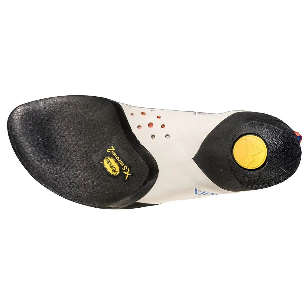 Buty wspinaczkowe La Sportiva Solution są miękkie i bardzo wrażliwe na końcówce. Anatomicznie ukształtowany zapiętek doskonale utrzymuje buty na miejscu podczas uderzeń piętą. Wytrzymała gumowana końcówka pozwala na precyzyjne toe-in, toe pull i inne triki overhang. But nie przesuwa się na stopie dzięki systemowi Lock Harness, który składa się z dwóch przecinających się pasków wewnątrz buta, które mocno trzymają stopę na miejscu. Dopasowanie buta zapewnia pasek z jedną klamrą na rzep.