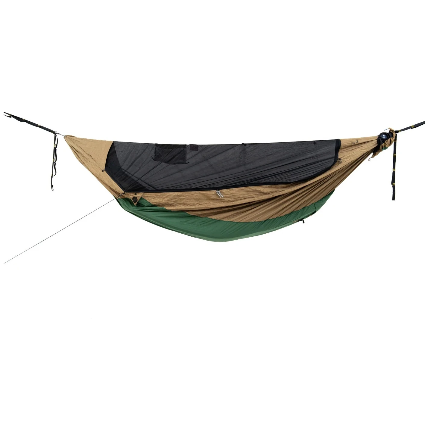 Okazało się, że seria Moonquilt oferuje najlepszy komfort spania na świeżym powietrzu, istnieje kilka scenariuszy, w których rozwiązanie hamakowe z materacem może uratować dzień. Hamak ProMat o szerokości 1,7 m jest wyposażony w kieszeń, która pasuje do wszystkich standardowych materacy.