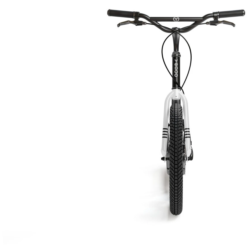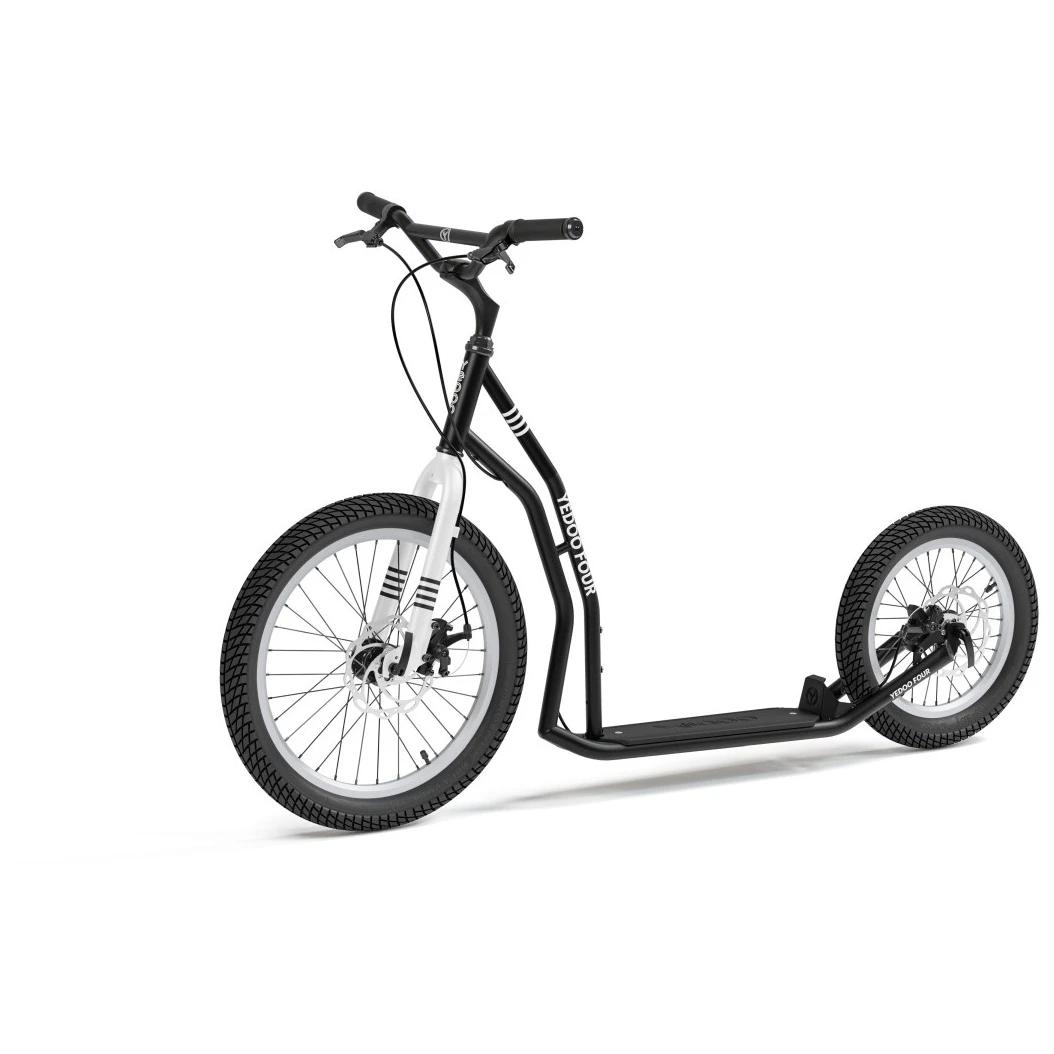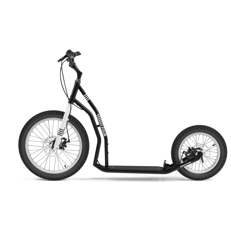 Yedoo Four to pełnowymiarowa hulajnoga miejska dla starszych dzieci i dorosłych. Wytrzymała, kompaktowa stalowa rama jest łatwa do przenoszenia i przechowywania. Waga z wbudowaną nóżką wynosi 11,5 kg, przy nośności do 150 kg. Kola 20"/16" wraz z szerszymi oponami może bezpiecznie i wygodnie poruszać się po wszystkich nawierzchniach (asfalt, kostka brukowa i drogi gruntowe).