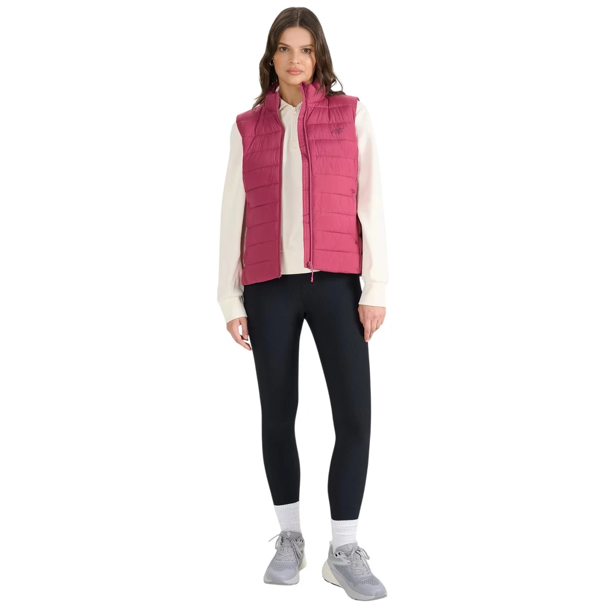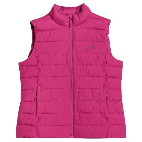 Kamizelka damska Vest Jacket F218 marki 4F to lekka i praktyczna warstwa na cieplejsze dni i okresy przejściowe. Dzięki krojowi slim dopasowuje się do sylwetki i podkreśla sportową linię ciała. Poziome pikowanie nie tylko podkreśla outdoorowy wygląd, ale także równomiernie rozkłada wypełnienie i poprawia izolację termiczną. Kamizelka łatwo się składa, nie zajmuje miejsca i jest idealna do codziennego noszenia i aktywności sportowych.