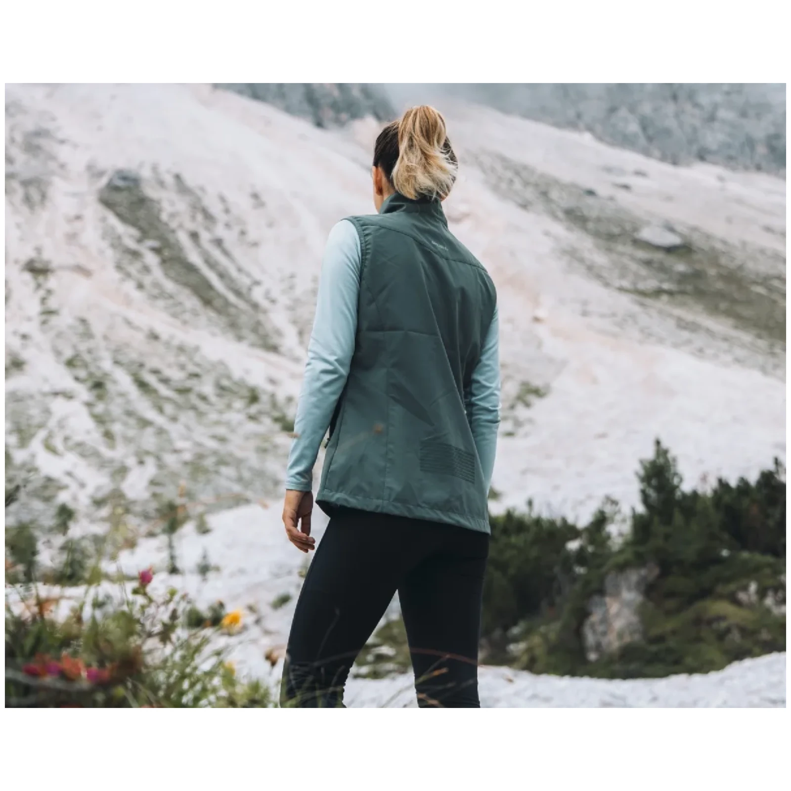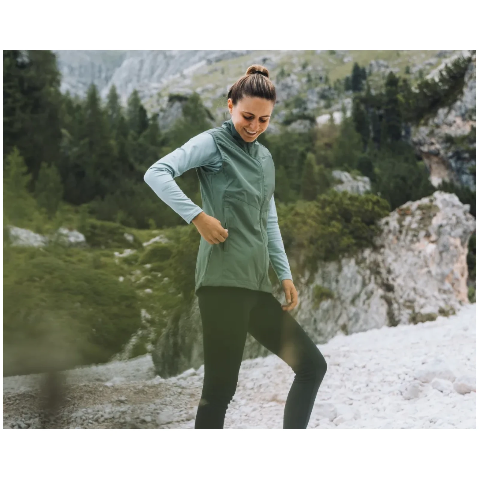 Damska kamizelka softshell Salien L to uniwersalny element garderoby dla aktywnych kobiet, które spędzają czas na łonie natury i w mieście. Dzięki lekkiemu i elastycznemu materiałowi zapewnia dużą swobodę ruchów podczas turystyki, uprawiania sportu i codziennego noszenia. Praktyczny krój uzupełniony wydłużonym tyłem pomaga chronić plecy podczas ruchu w chłodniejszej pogodzie.