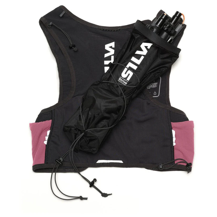 Z tyłu znajdują się dwie kieszenie - dolna podłużna kieszeń i główna kieszeń tylna, która ma dwa wyjścia na kabel czołówki lub wąż worka hydracyjnego. Wewnątrz znajduje się mała kieszeń przeznaczona do mocowania baterii. Kije można przymocować za pomocą elastycznych regulowanych pętli lub umieścić w torbie Silva Quiver, która umożliwia łatwiejsze wyjmowanie kijów z kamizelki podczas wyścigów (torba nie jest dołączona).