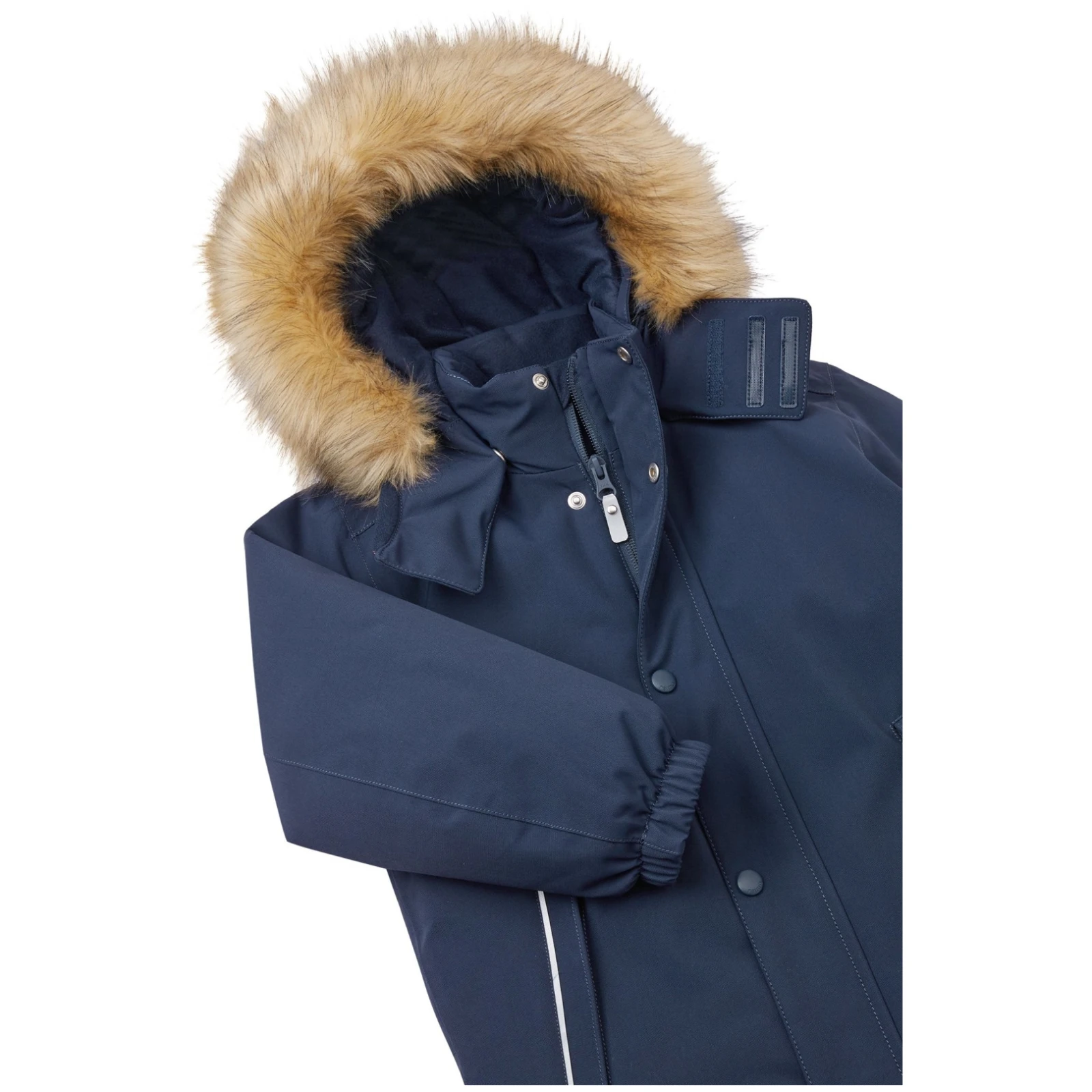- bezpieczny,odpinany i regulowany kaptur z odpinanym wykończeniem ze sztucznego futra