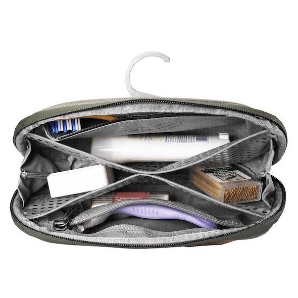 Dzięki zintegrowanemu aluminiowemu haczykowi saszetkę można wygodnie zawiesić, lub postawić pionowo na płaskiej powierzchni. Wnętrze wyposażone jest w wewnętrzne przegrody z siateczki pokrytej silikonem, magnetycznie zamykaną kieszeń na szczoteczkę do zębów oraz dodatkowe kieszenie na drobne kosmetyki.