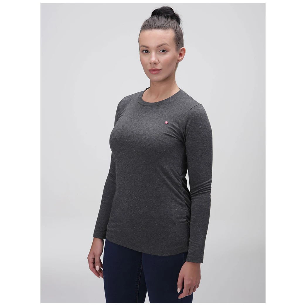 Loap Baxana to damska koszulka z długim rękawem, którą bez obaw możesz założyć na aktywności rekreacyjne, a także wybrać się w niej do miasta lub do pracy. Dzięki połączeniu poliestru i wiskozy koszulka wyróżnia się lekkością, właściwościami szybkoschnącymi i niską gniotliwością. Materiał jest również przyjemnie elastyczny. W pasie ta koszulka o skądinąd klasycznym kroju jest lekko marszczona, a dolna krawędź jest bez ściągacza. Całościowo ładnie podkreśla sylwetkę. Zastosowanie lureksowej nici dodaje jej atrakcyjnego wyglądu i szyku.