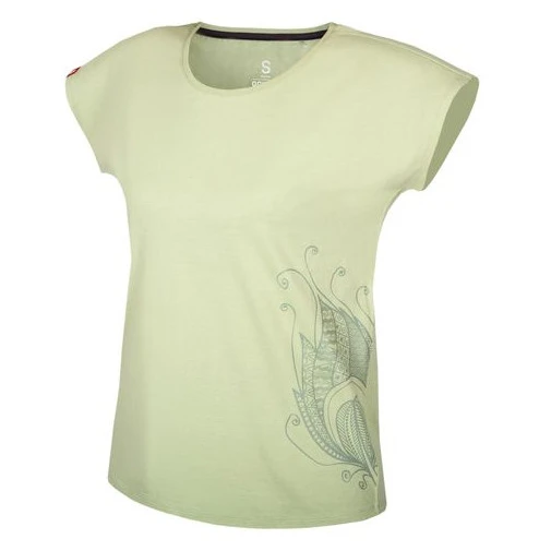 Damska koszulka Kimo T Women Blossom-Art firmy Ocún to wygodna bawełniana koszulka wspinaczkowa z przyjemnym 2-way stretch, idealna na ściankę i do codziennego noszenia.