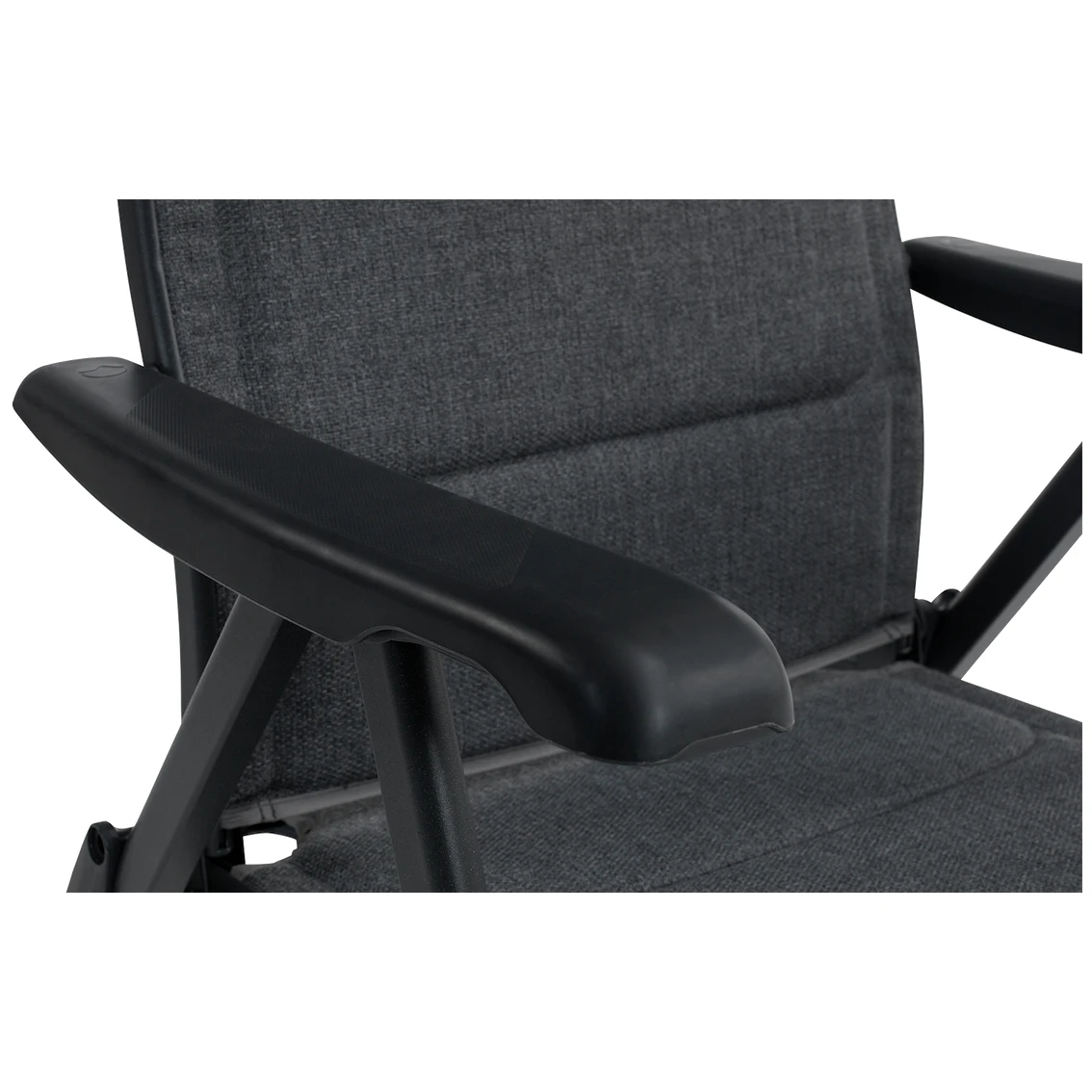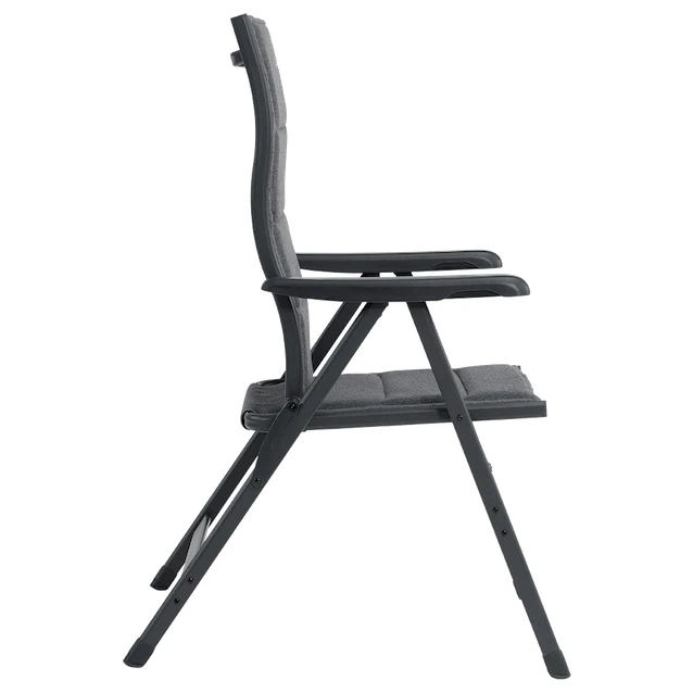 Grube wyściełanie z szczotkowanego poliestru dobrze izoluje od zimna, ma doskonałą trwałość kolorów i odporność na promieniowanie UV. Jest uzupełnione wysokiej jakości lekką ramą aluminiową. To gwarancja trwałości. Kłódka zapobiegnie niepożądanemu złożeniu. Krzesło ma wygodne podłokietniki i wysokie ergonomiczne oparcie dla optymalnego podparcia karku. Oparcie można ustawić w jednej z siedmiu pozycji.