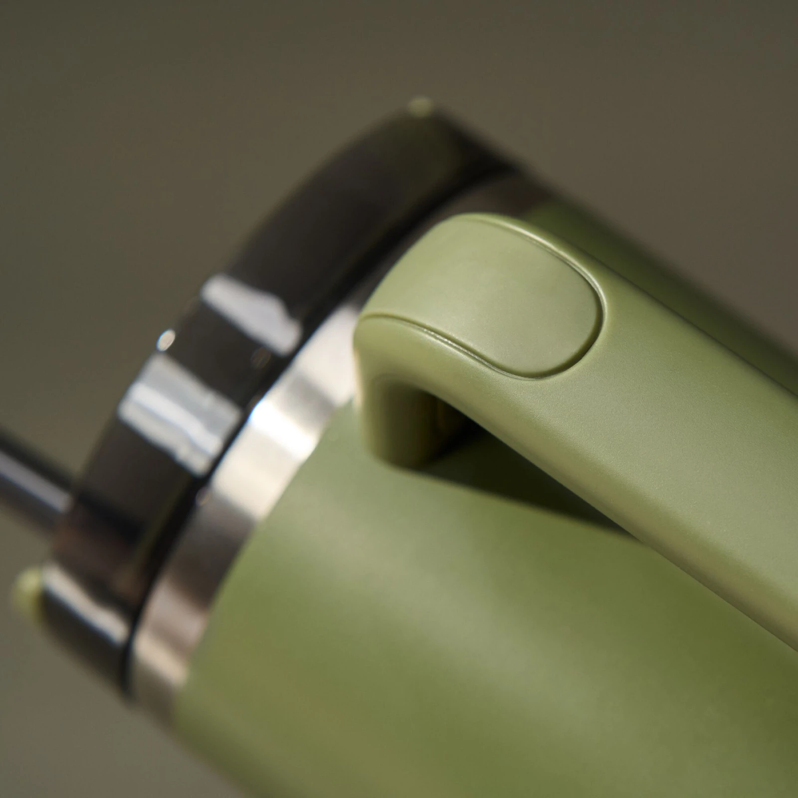 Kubek termiczny Quencher H2.Stanley O z jest bardzo łatwa do uchwycenia i ma miękkie, aksamitne wykończenie. Stanley Można go myć w zmywarce (przeczytaj uważnie, jak to zrobić) i ma całą trwałość, jaką może mieć marka. Miękka matowa powierzchnia z konstrukcją ze stali nierdzewnej z recyklingu i dwuścienną izolacją próżniową. W górnej części kubka znajduje się zgłoszona do opatentowania pokrywka FlowState™ z obrotowym zamknięciem w trzech pozycjach: 1. pozycja otworu na słomkę zaprojektowana tak, aby zapobiegać wylewaniu się zawartości, w tym specjalna uszczelka utrzymująca słomkę wielokrotnego użytku na miejscu, 2. otwór do bezpośredniego picia napoju oraz 3. pokrywka na całej długości zapewniająca większą odporność na rozlanie i rozsypanie.