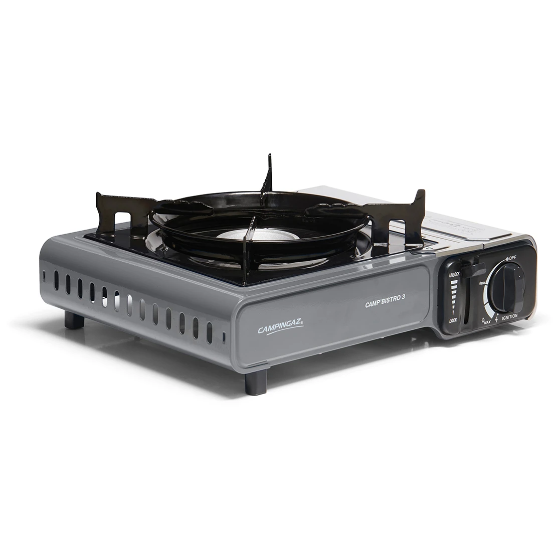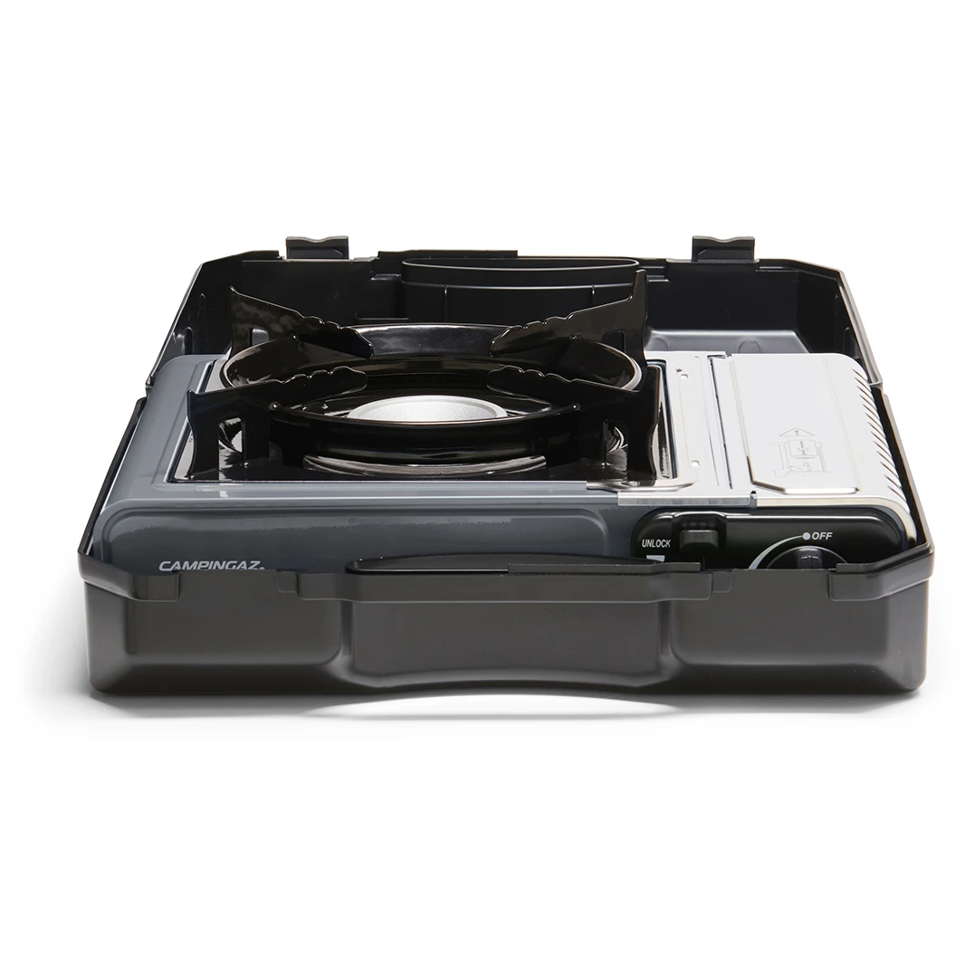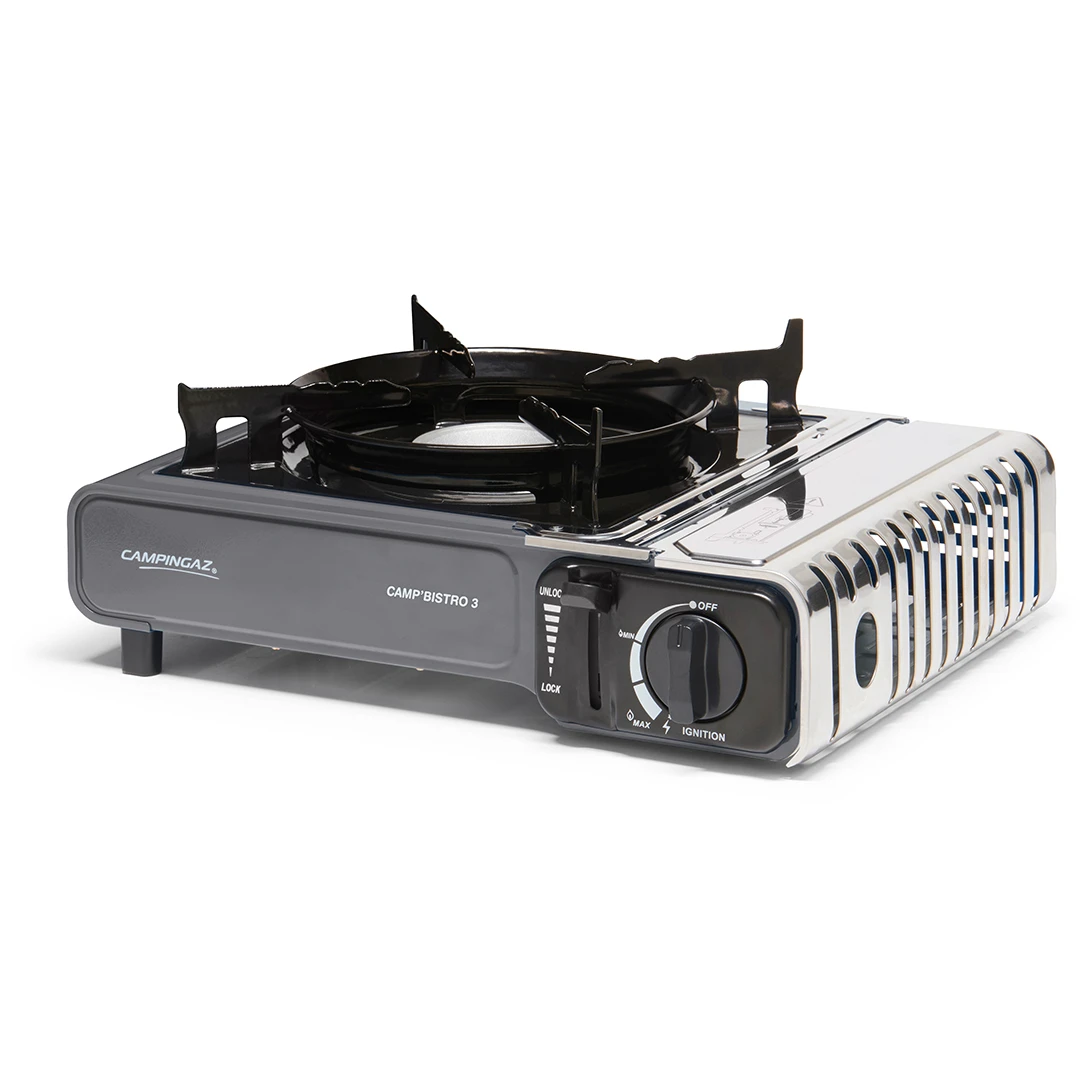 Najnowsza wersja udanej kuchenki gazowej Campingaz® Camp'Bistro 3 z dwoma zintegrowanymi systemami bezpieczeństwa, pokrywą ze stali nierdzewnej i ulepszonym podparciem dla garnków i patelni, aby zapewnić stabilność i chronić płomień przed wiatrem. Cała kuchenka jest stabilna nawet przy użyciu większych garnków. Kuchenka jest umieszczony w plastikowej walizce ułatwiającej transport i przechowywanie. wkład Osłona jest wykonany ze stali nierdzewnej, a zwiększona przestrzeń i powiększone otwory pomagają zapobiegać przegrzaniu. Podwójny bezpiecznik ogranicza przepływ gazu i wyrzuca kartridż w przypadku przegrzania.