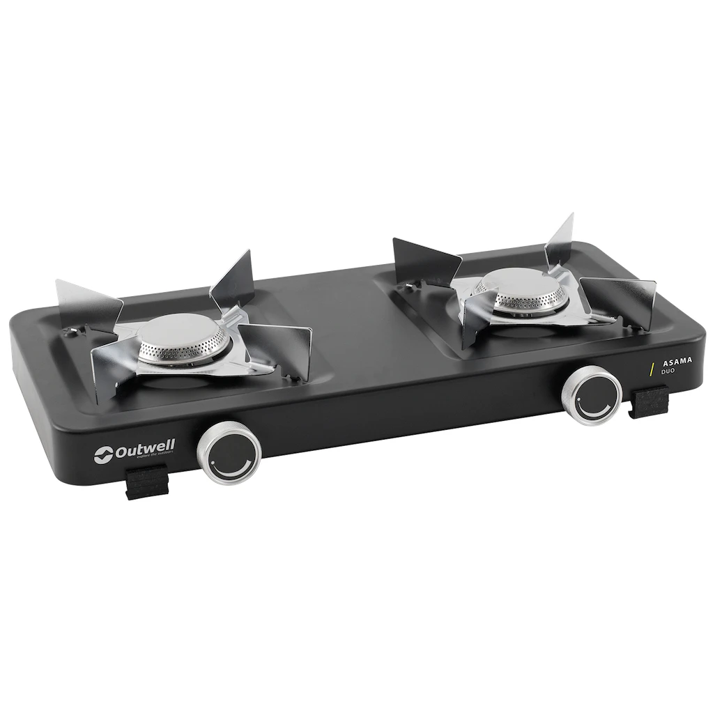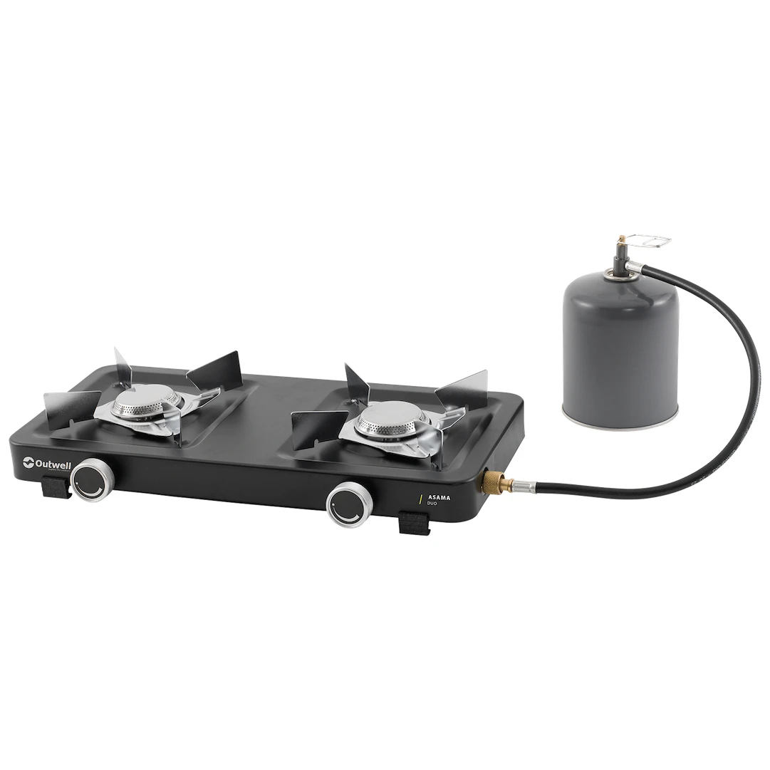 Dwupalnikowa kuchenka gazowa Asama Duo od duńskiego producenta Outwell to niezbędny pomocnik na kempingu i w ogrodzie. Materiał ze stali i stali nierdzewnej gwarantuje długą żywotność. Konstrukcja jest niska, bardzo stabilna dzięki plastikowym nóżkom a palniki są wyposażone w szeroką kratkę do bezpiecznego stawiania naczynia.