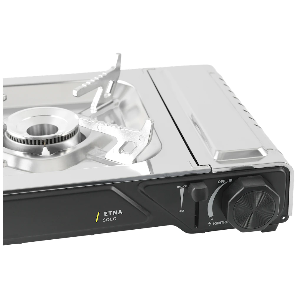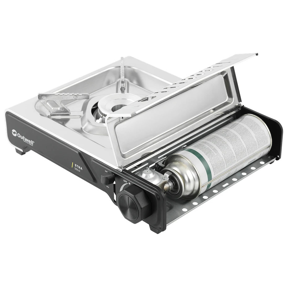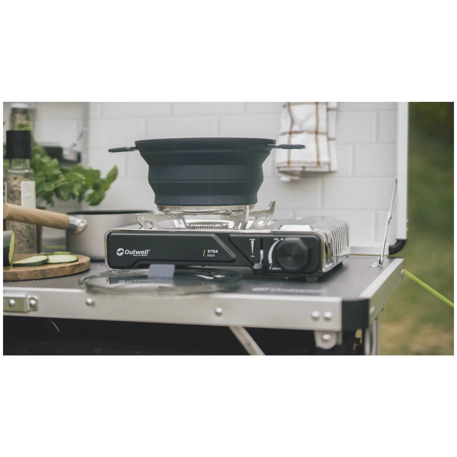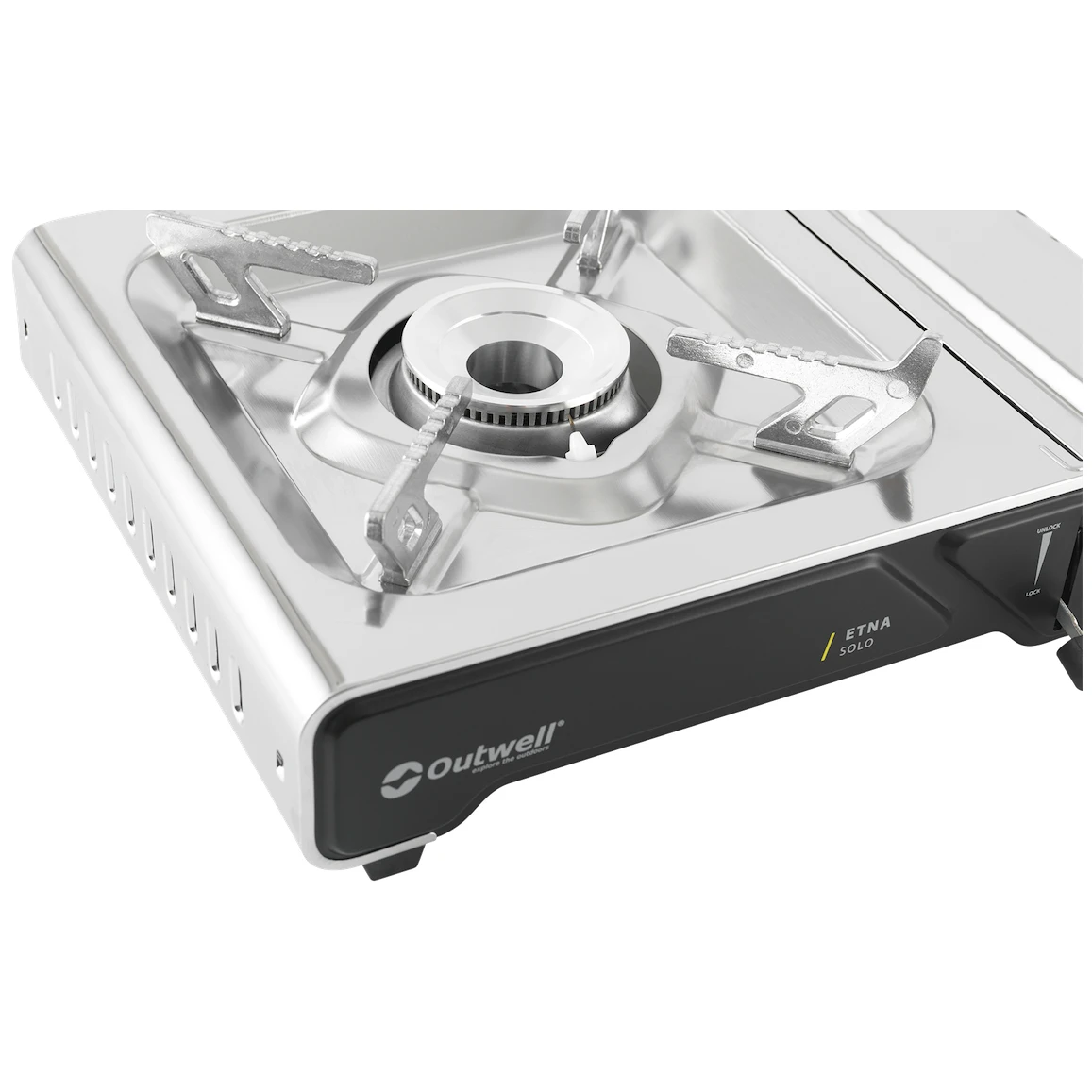 Jednopalnikowa kuchenka gazowa Etna Solo od duńskiego producenta Outwell to niezbędny pomocnik na kempingu i w ogrodzie. Materiał ze stali i stali nierdzewnej gwarantuje długą żywotność. Konstrukcja jest niska, bardzo stabilna dzięki plastikowym nóżkom a palniki są wyposażone w szeroką kratkę do bezpiecznego stawiania naczynia.