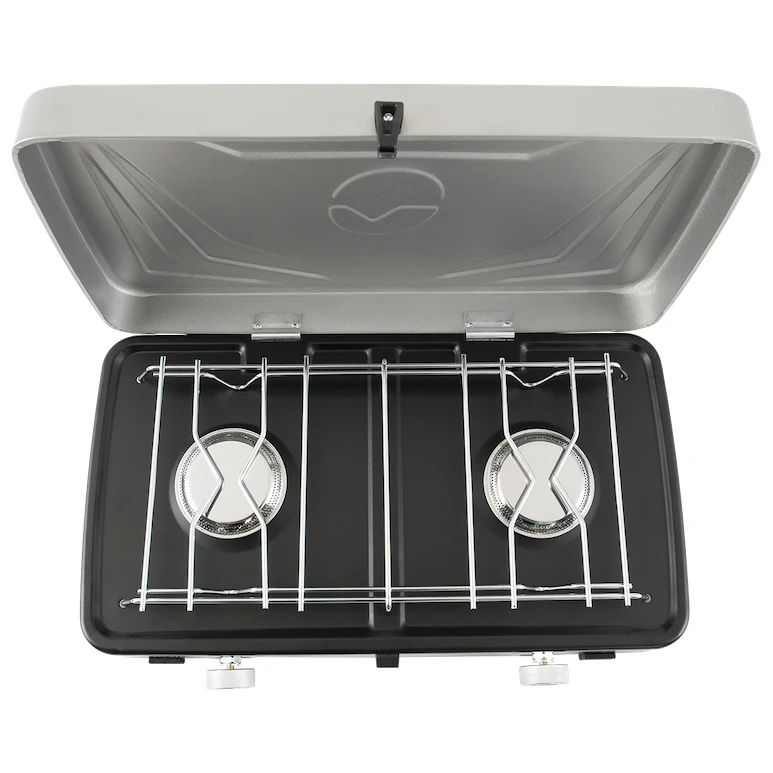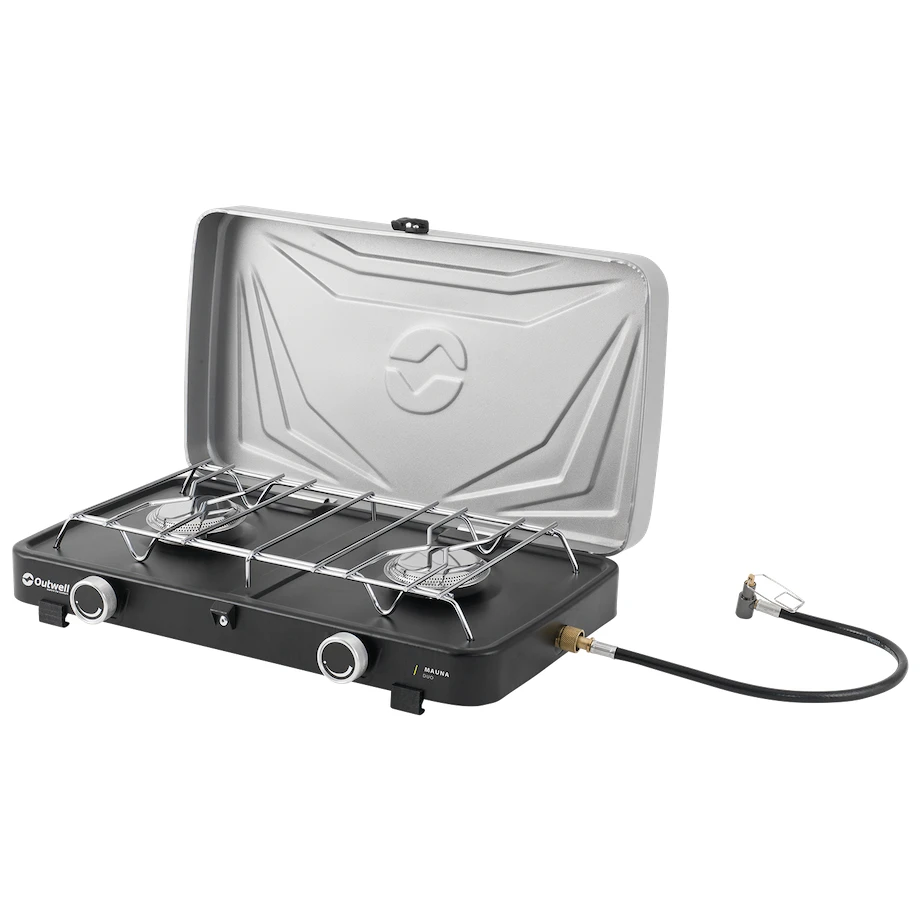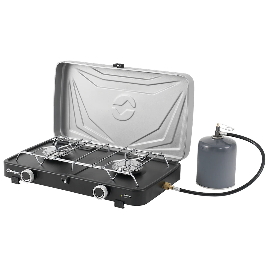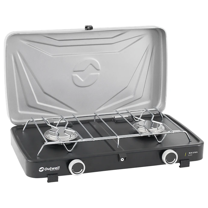 Dwupalnikowa kuchenka gazowa Mauna Duo od duńskiego producenta Outwell to niezbędny pomocnik na kempingu i w ogrodzie. Materiał ze stali i stali nierdzewnej gwarantuje długą żywotność. Konstrukcja jest niska, bardzo stabilna, z plastikowymi nóżkami, a palniki są wyposażone w szeroką kratkę do bezpiecznego stawiania naczynia. Kuchenka posiada solidną pokrywę, za pomocą której łatwo ją zapakujesz do walizki, dzięki czemu jest łatwa do przenoszenia.
