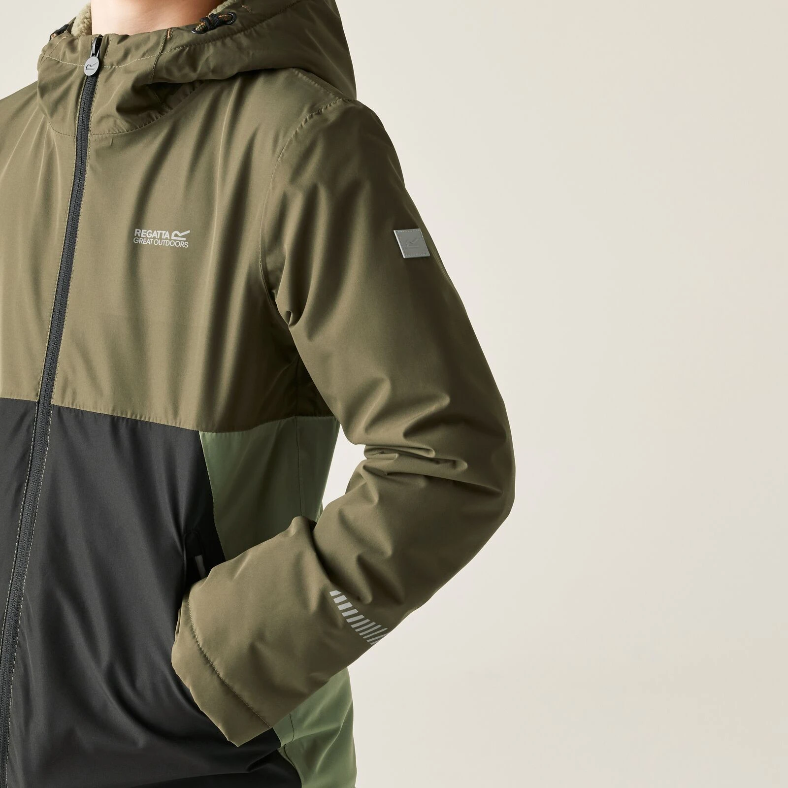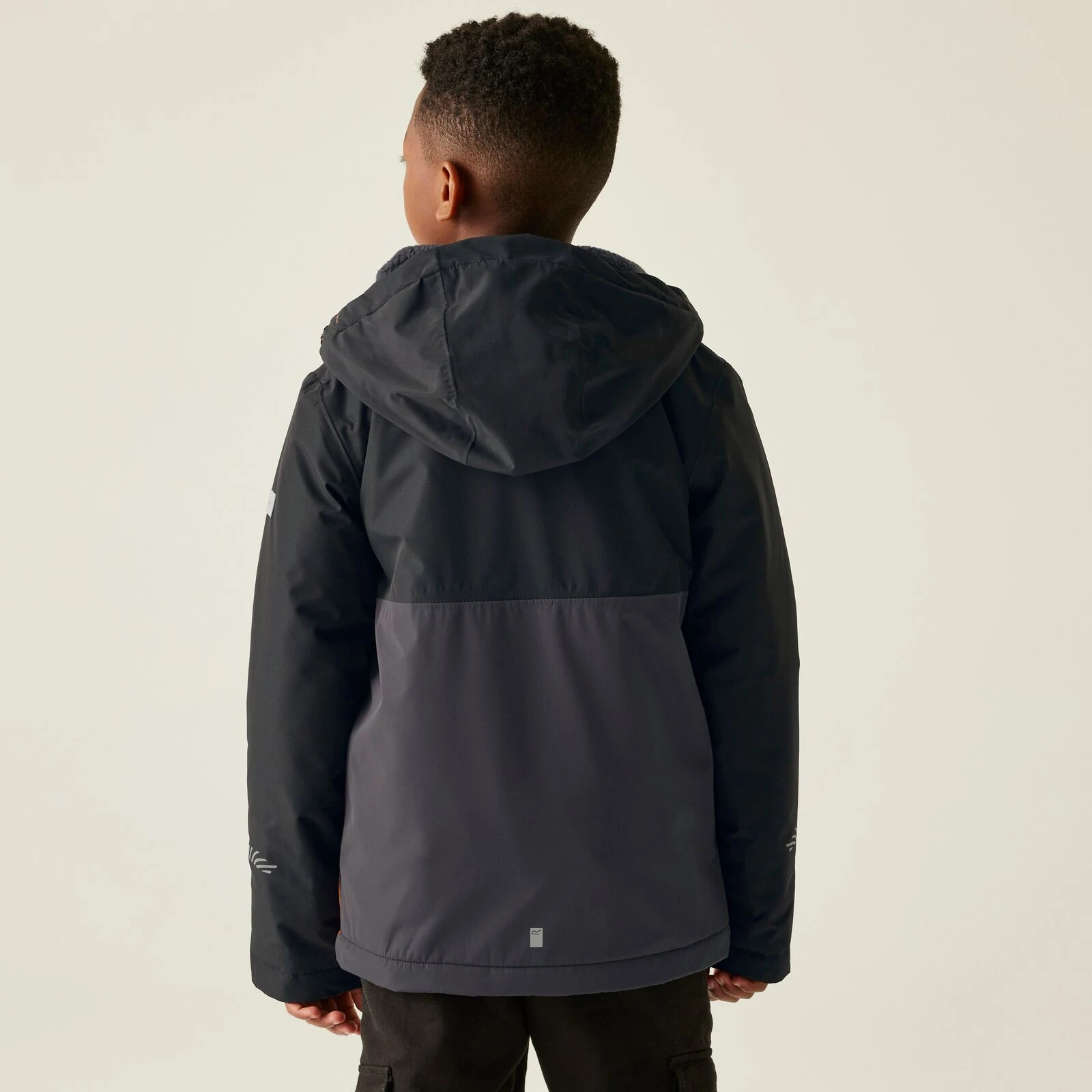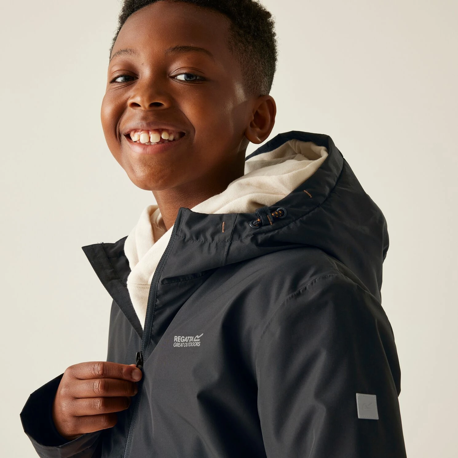 Kurtka dziecięca Hillain Warm Lined marki Regatta ma podszewkę z polaru borg i elementy odblaskowe. Stały kaptur i kieszenie na zamek sprawiają, że idealnie nadaje się na dni szkolne lub zabawy na świeżym powietrzu przy nieprzewidywalnej pogodzie.