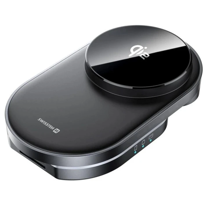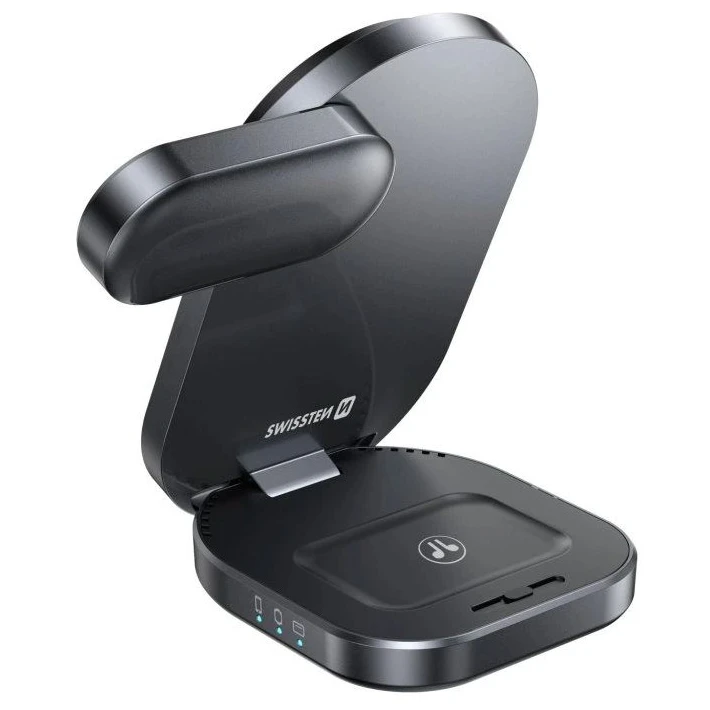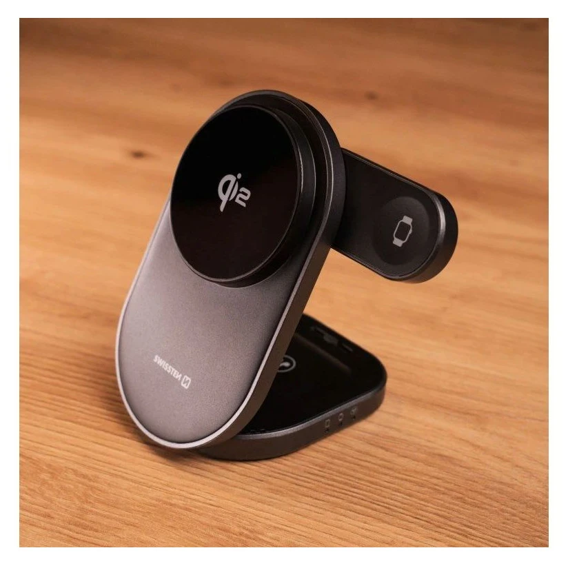 Z rozkładaną bezprzewodową ładowarką Swissten MagBase 3w1 zyskasz eleganckie i praktyczne rozwiązanie do jednoczesnego ładowania iPhone'a, Apple Watch i słuchawek. Dzięki technologii Qi2 i magnetycznemu centrowaniu (MagSafe) oferuje idealne wyrównanie i szybkie ładowanie do 15 W.