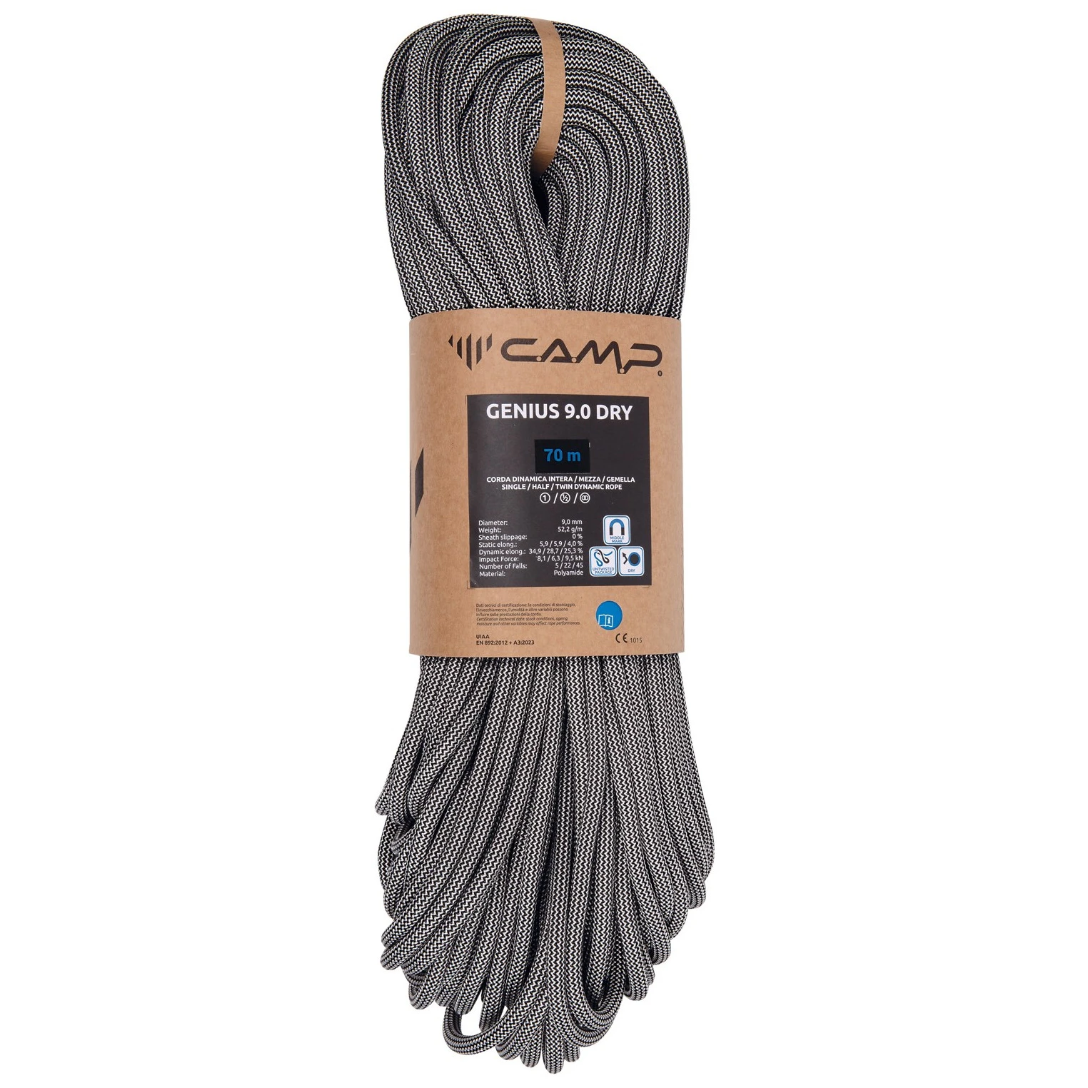 Camp Genius 9.0 Dry - 70m to jedna z najlżejszych lin o średnicy 9.0 na rynku. Potrójna klasa odporności i wodoodporne wykończenie sprawiają, że jest gotowa na trudny teren.