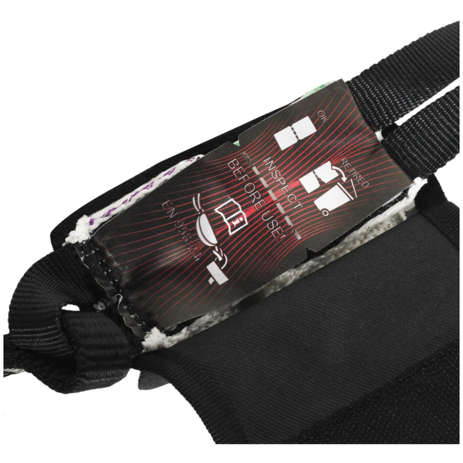 Łatwe mocowanie do wszystkich rodzajów uprzęży zapewnia oczko mocujące o szerokości 15 mm, wykonane z lekkich i wytrzymałych włókien HMPE z poliestrową warstwą kryjącą dla większej odporności. Elastyczne, asymetryczne ramiona o szerokości 15 mm zapobiegają zakrztuszeniu głowy lub kończyn w razie wypadku, przy czym długość zestawu po podłączeniu do uprzęży wynosi 85 cm, a przy maksymalnym wydłużeniu osiąga 130 cm. Elastyczne ramiona przeszły 50 000 rozciągnięć w testach rozwojowych, co zapewnia bezpieczeństwo podczas poruszania się po ferratach.