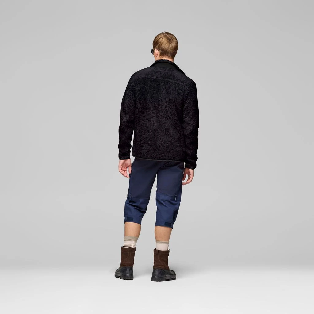Wchodząc do chłodniejszego lasu, poczujesz, jak materiał Warm3 zatrzymuje ciepło wokół ciała, nie powodując uczucia chłodu przy zwiększonym tempie – konstrukcja tkaniny zatrzymuje warstwy powietrza, ale umożliwia również odprowadzanie wilgoci. W obszarze kołnierza i kieszeni znajduje się wierzchnia tkanina z recyklingowanej mieszanki (organiczna bawełna, recyklingowany nylon, elastan), która zapewnia lekką ochronę przed wiatrem i strukturę przy zachowaniu komfortu wewnątrz.