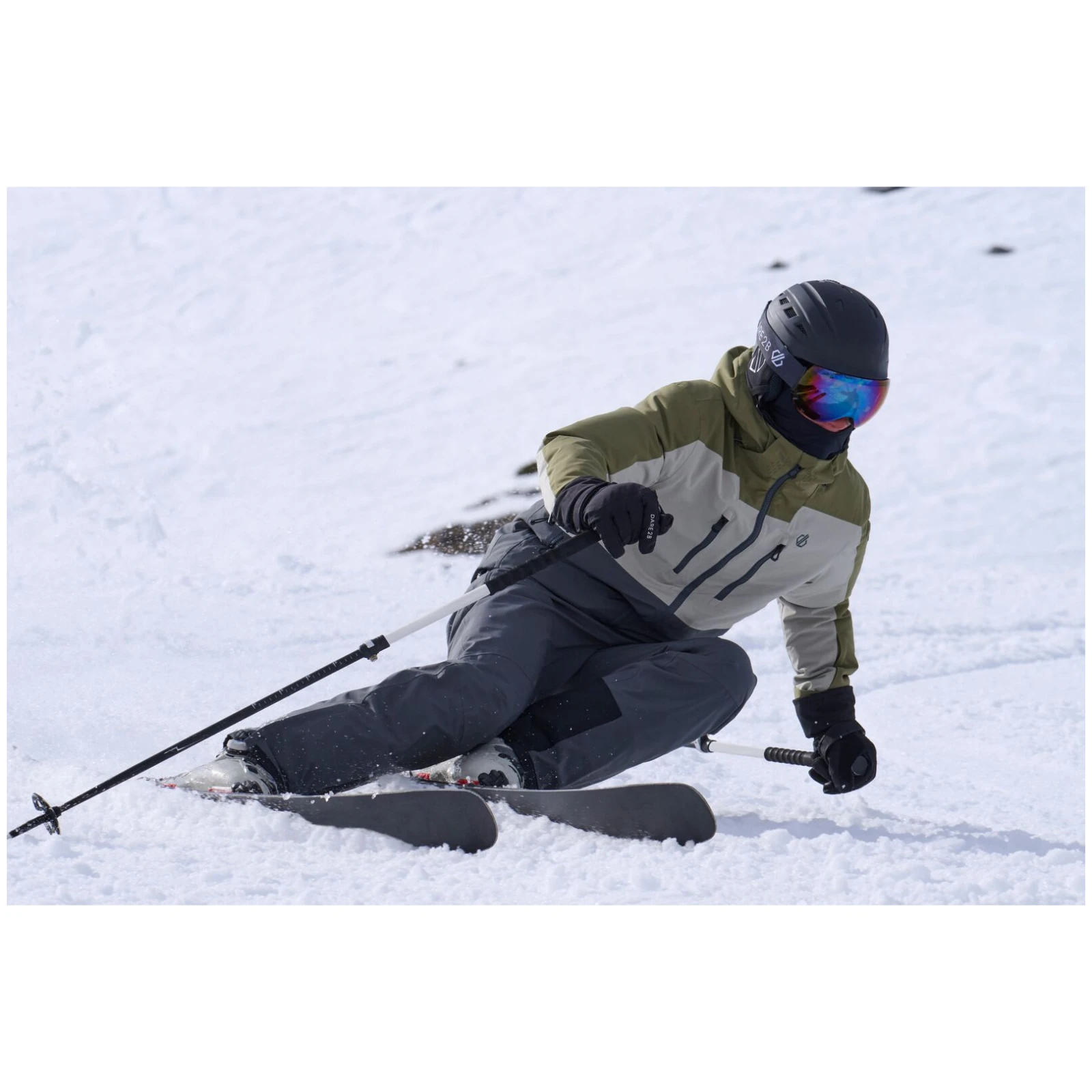 Kurtka oferuje wszystkie ważne elementy: kieszeń na karnet narciarski, stały pas śnieżny, wewnętrzną kieszeń z siatki ze ściereczką do okularów oraz odpinany techniczny kaptur z regulowanym ściągaczem i drucianym daszkiem. Kominiarka jest dodatkowo kompatybilna z kaskiem.