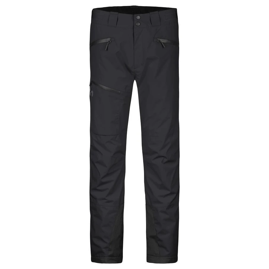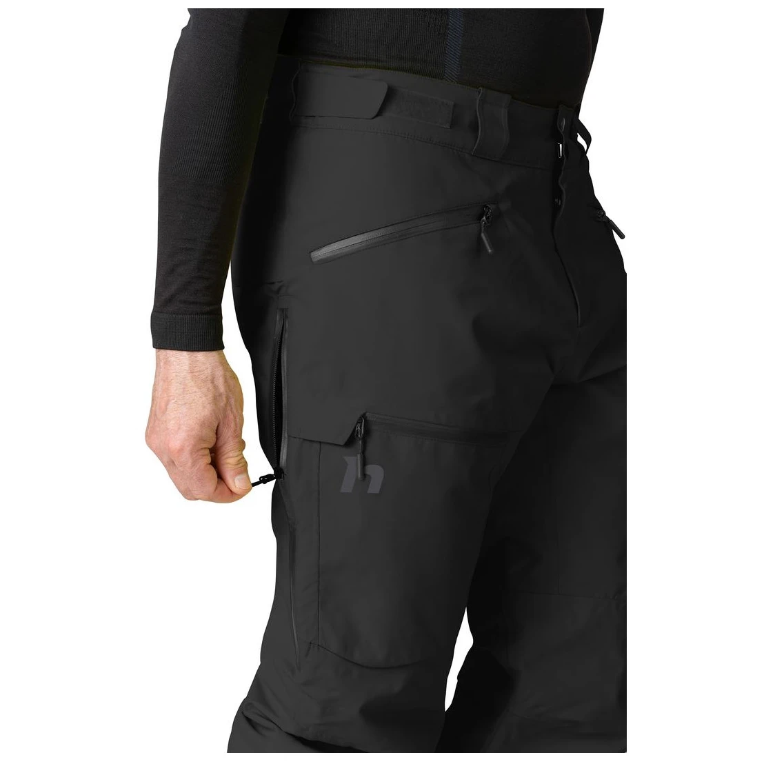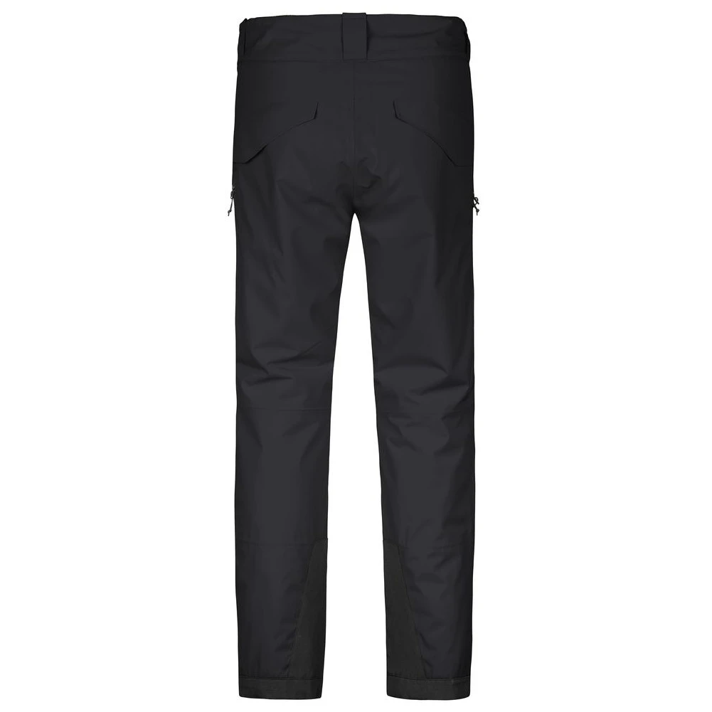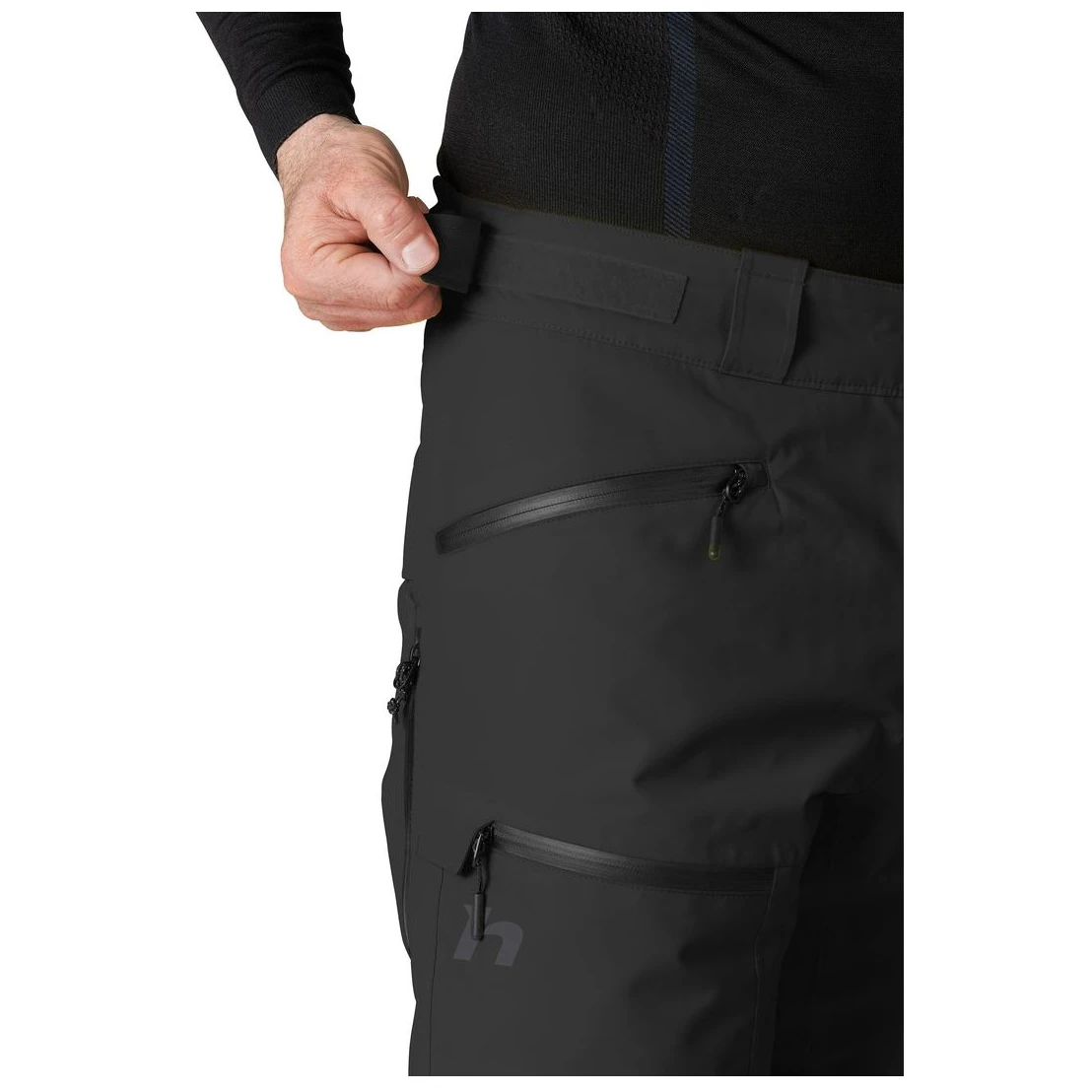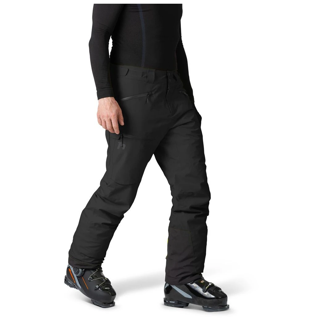 Spodnie mają techniczny krój z anatomicznie ukształtowanymi kolanami i podwyższonym stanem, aby idealnie leżały i umożliwiały swobodę ruchów. Praktyczne detale obejmują główne kieszenie z wodoodpornymi zamkami, kieszeń na udzie z zamkiem błyskawicznym, wentylację po zewnętrznej stronie nogawek, mankiet przeciwśnieżny oraz rozcięcie z zamkiem błyskawicznym w dolnej części nogawki. Podklejone szwy i klejone detale zapewniają ochronę przed przenikaniem śniegu i wilgoci, a regulacja obwodu pasa paskiem z gumą na rzepy umożliwia doskonałe dopasowanie.