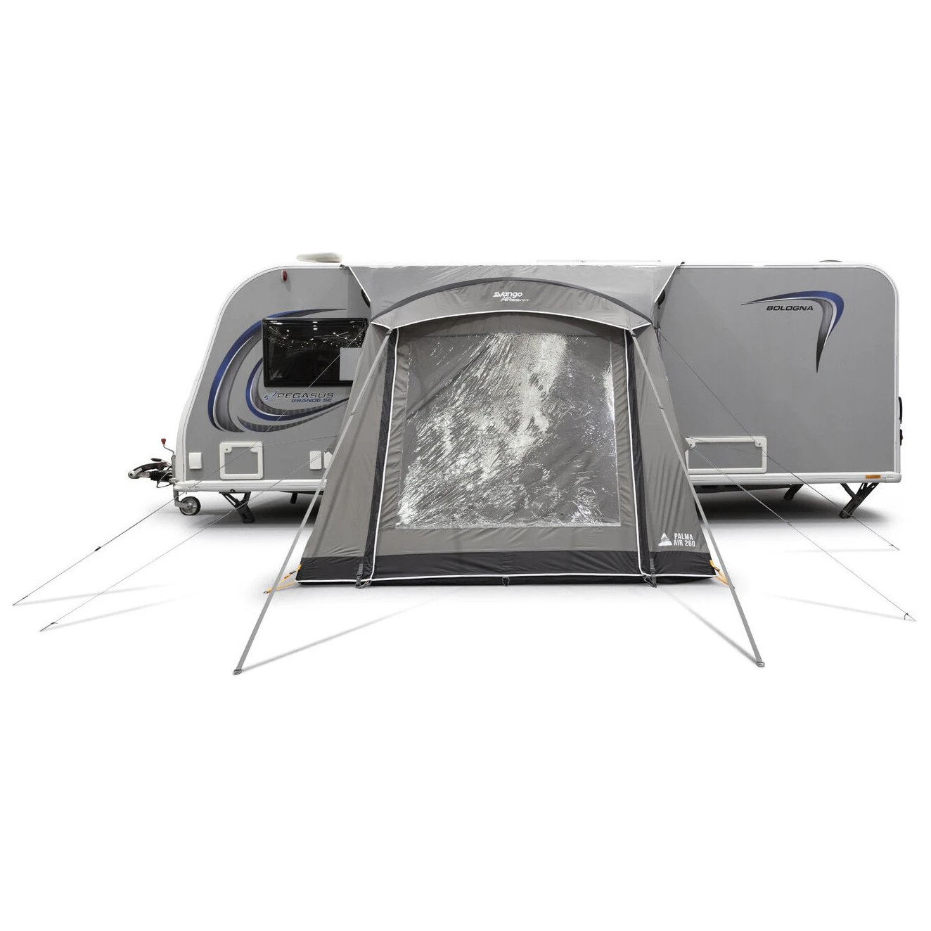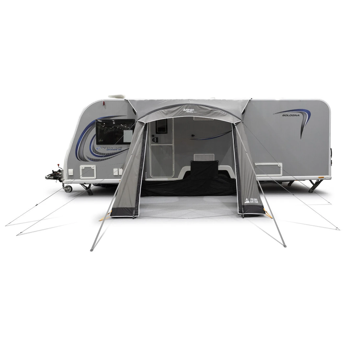 Namiot do przyczepy kempingowej Palma Air 260 marki Vango z technologią AirBeam® umożliwia szybkie rozstawienie bez stelaża, posiada wytrzymałą tkaninę Dynamic Weave 100™ oraz elastyczną przestrzeń do spożywania posiłków i przechowywania rzeczy.