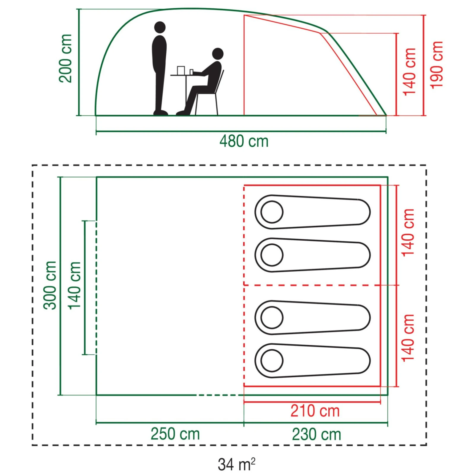 Przestronna część dzienna jest wystarczająco duża, aby pomieścić stół jadalny i krzesła, tworząc wygodne miejsce do wspólnego spożywania posiłków lub spędzania czasu podczas niekorzystnej pogody. Duże, oddzielne sypialnie bez problemu pomieszczą dwuosobowe materace dmuchane, co znacznie zwiększa komfort snu w porównaniu do tradycyjnych karimat.