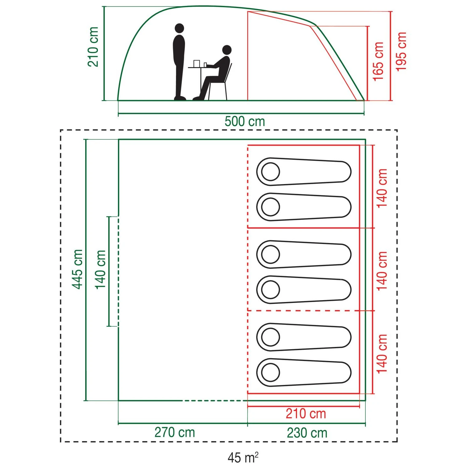 Przestronna część dzienna jest wystarczająco duża, aby pomieścić stół i krzesła, dzięki czemu stworzysz komfortowe miejsce do wspólnego spożywania posiłków lub spędzania czasu podczas złej pogody. Duże, oddzielne sypialnie bez problemu pomieszczą dwuosobowe materace dmuchane, co znacznie zwiększa komfort snu w porównaniu do zwykłych karimat.