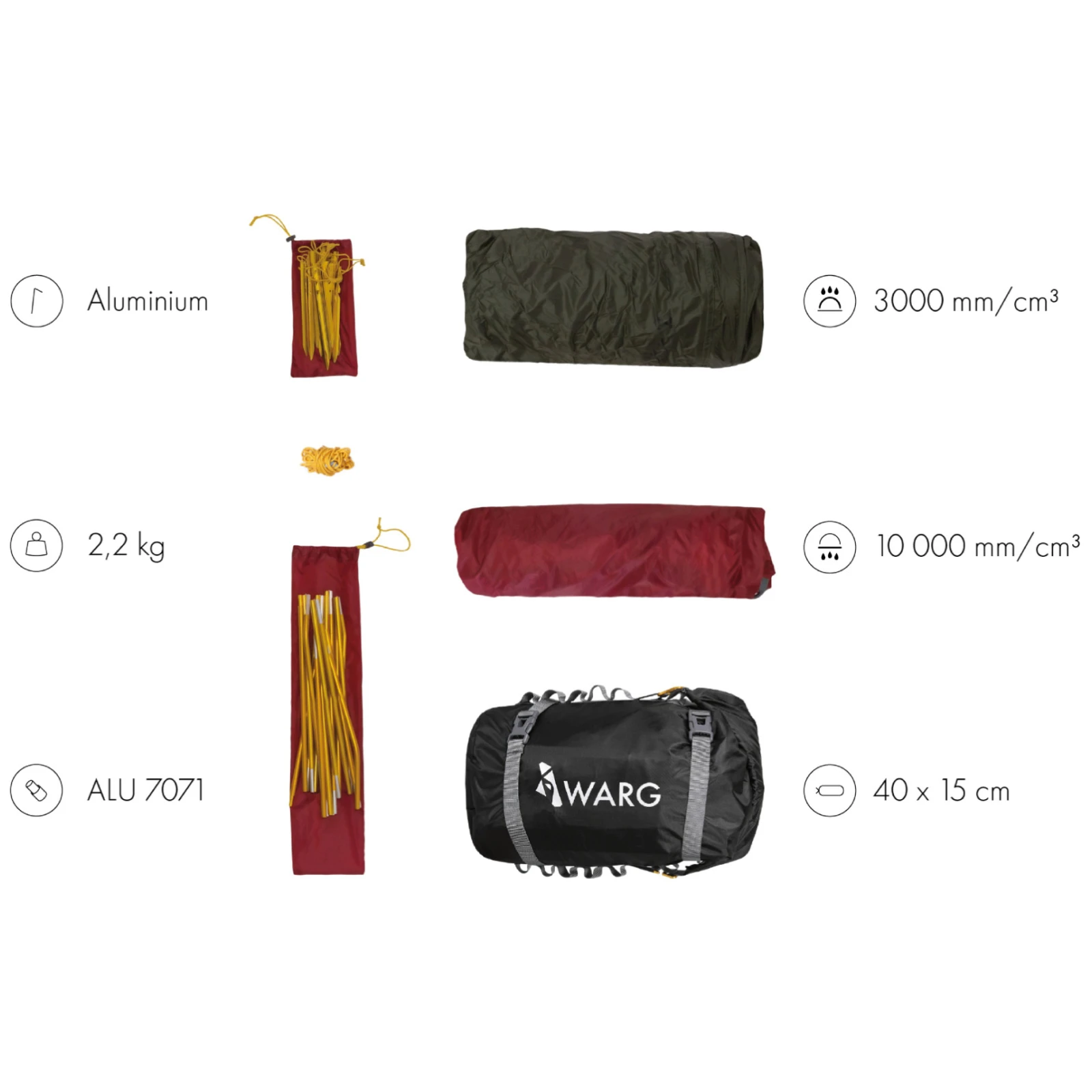 rozkładany w 5 minut, pakowany w 3 minuty, lekki, łatwy do przechowywania, idealny na wielodniowe wędrówki (GR, AltaVia...) przez boczne wejścia zmieści się nawet plecak o pojemności 60 l, szerokość namiotu wewnętrznego jest idealna w porównaniu do innych namiotów Warg dla dwóch osób, klasyczna konstrukcja z 2 masztami
