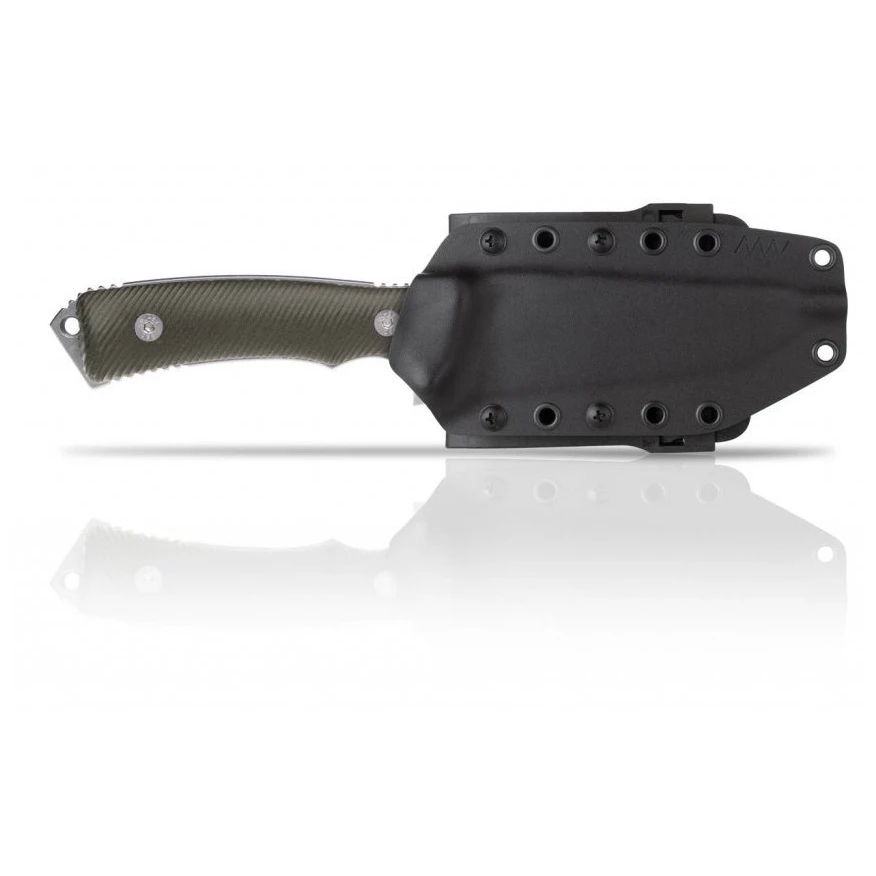 Ostrze wykonane jest z jednej z najlepszych stali na świecie, szwedzkiej Elmax. Ta najwyższej jakości stal jest osadzona w rękojeści noża i przechodzi aż do podstawy noża, gdzie znajduje się również końcówka do rozbijania szkła. Ostrze jest dodatkowo pokryte niezwykle trwałą powłoką DLC, która minimalizuje odblaski, zapobiega korozji i nadaje stalowej powierzchni doskonałe właściwości ślizgowe. Rękojeść Micarta zapewnia pewny chwyt w każdej sytuacji. Uchwyt z tego materiału jest wytwarzany metodą obróbki 3D i ma rowkowany uchwyt zapewniający pewny i bezpieczny chwyt. Docenisz również bransoletę z bezpiecznego paracordu, która zapobiega wypadnięciu noża z ręki podczas siekania. Cała konstrukcja jest utrzymywana razem przez połączenie solidnych gwintowanych tulei i czterech śrub M5, które są również specjalnie pokryte powłoką DLC.