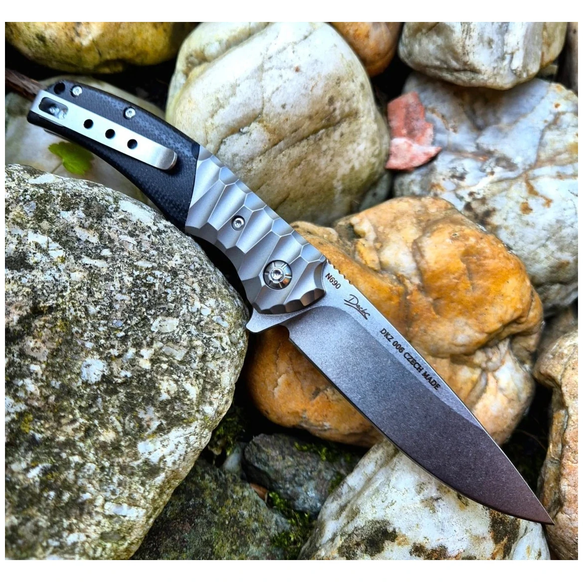 Uchwyt z wytrzymałego Tytanu i eleganckiej Micarty gwarantuje pewny i bezpieczny chwyt w każdych warunkach. Ostrze ze stali nierdzewnej N690 z matowym wykończeniem Stonewash oferuje doskonałe właściwości tnące i odporność na korozję. Dzięki osiowym łożyskom otwieranie i zamykanie noża jest wyjątkowo płynne, a solidna blokada LinerLock zapewnia maksymalne bezpieczeństwo podczas pracy. Praktyczne rowki na grzbiecie ostrza zwiększają kontrolę podczas cięcia i umożliwiają lepsze prowadzenie noża.
