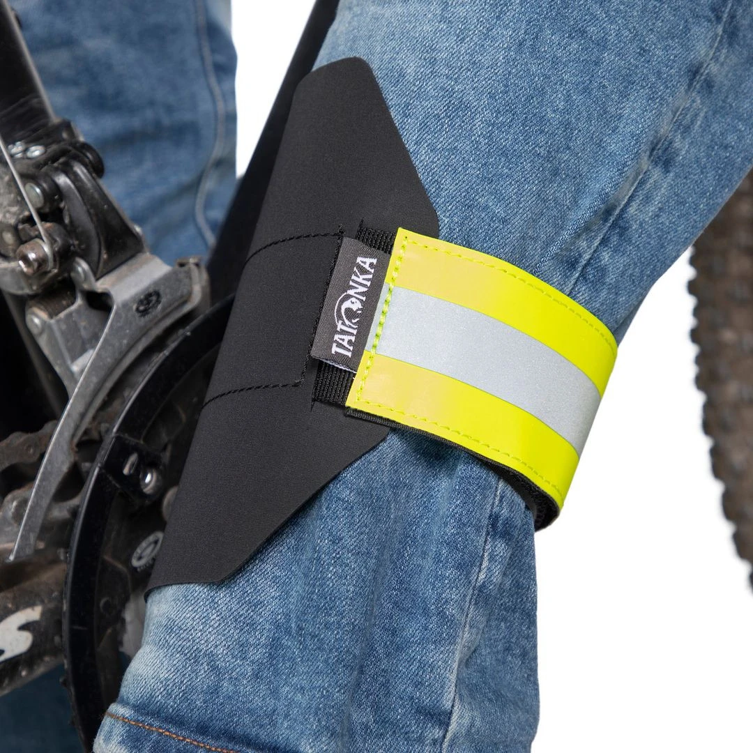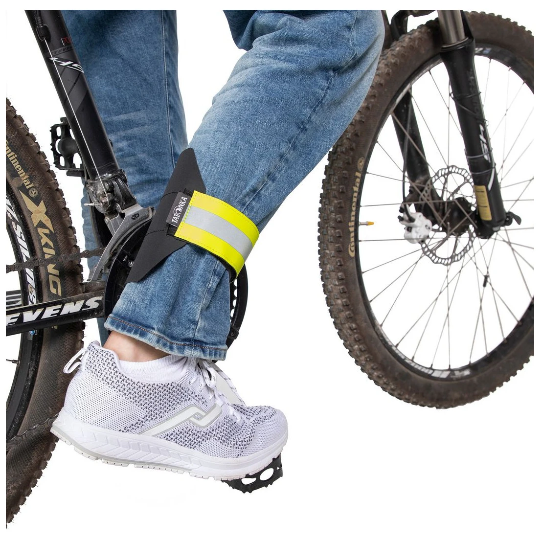 Regulowany ochraniacz na spodnie Pants Protector Tatonka z rzepem i odblaskową taśmą chroni nogawki przed łańcuchem i zabrudzeniami.