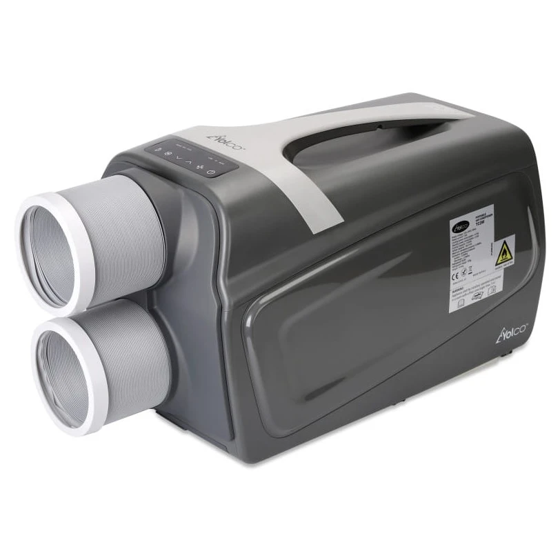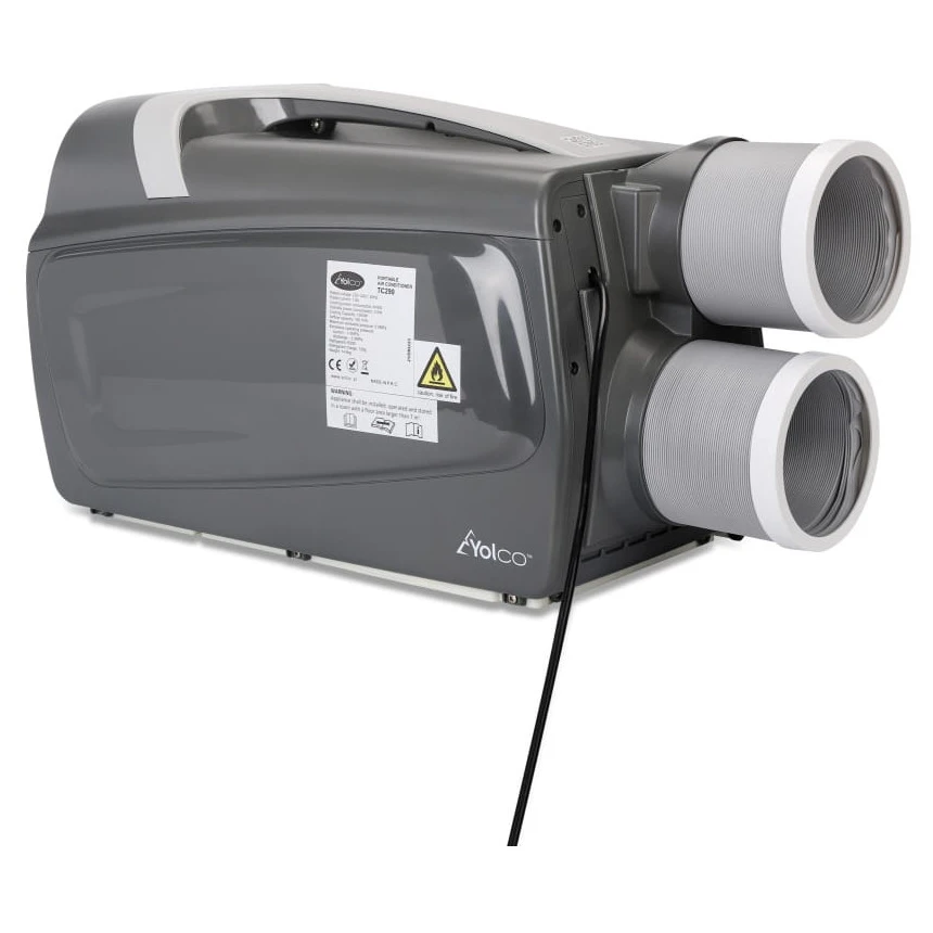 Klimatyzacja jest wyposażona w elastyczne rury wlotowe i wylotowe, które dopasowują się do przestrzeni. Praktyczny uchwyt ułatwia przenoszenie. Kompaktowe rozmiary sprawiają, że TC390 to idealny towarzysz na działkę, do kampera lub do małego biura.