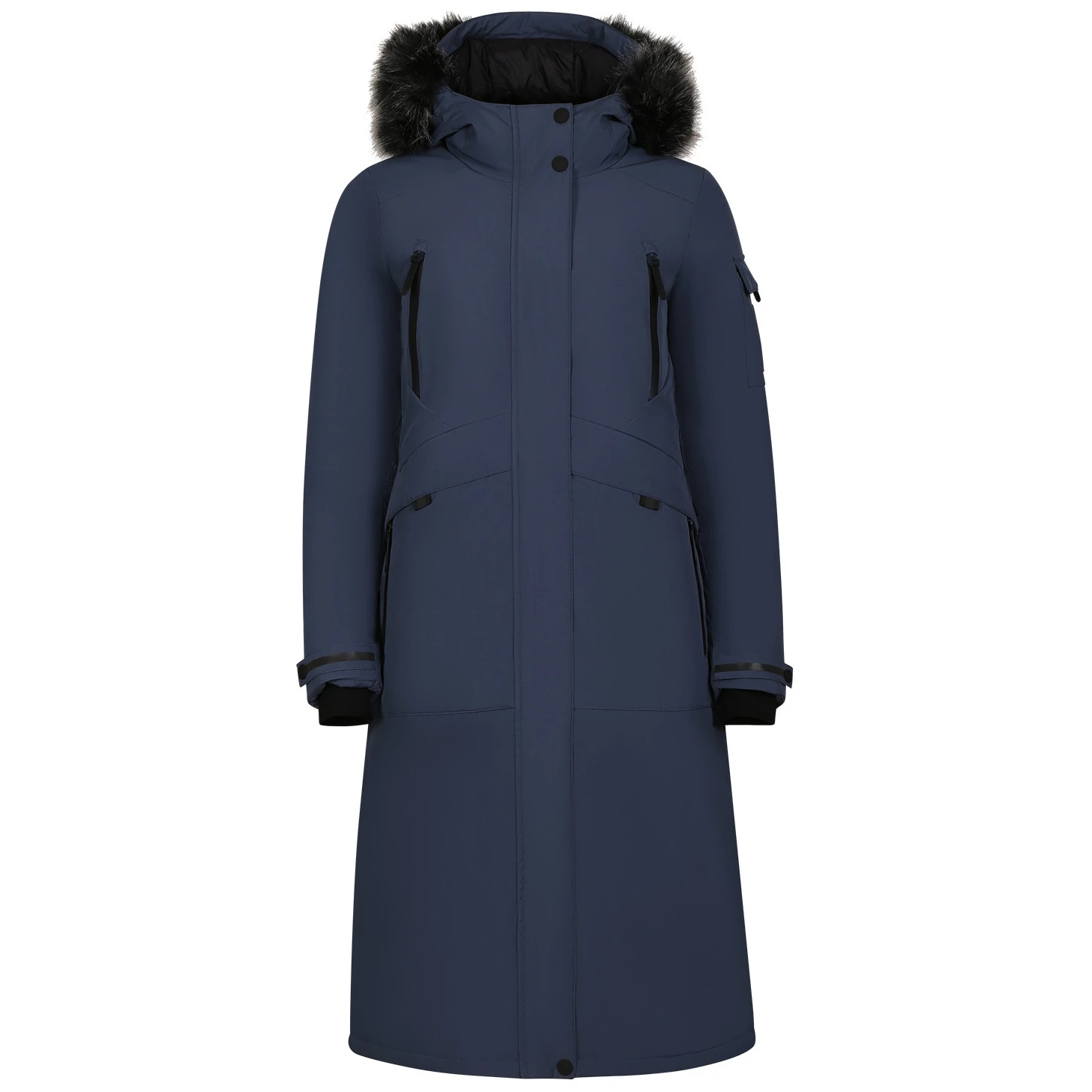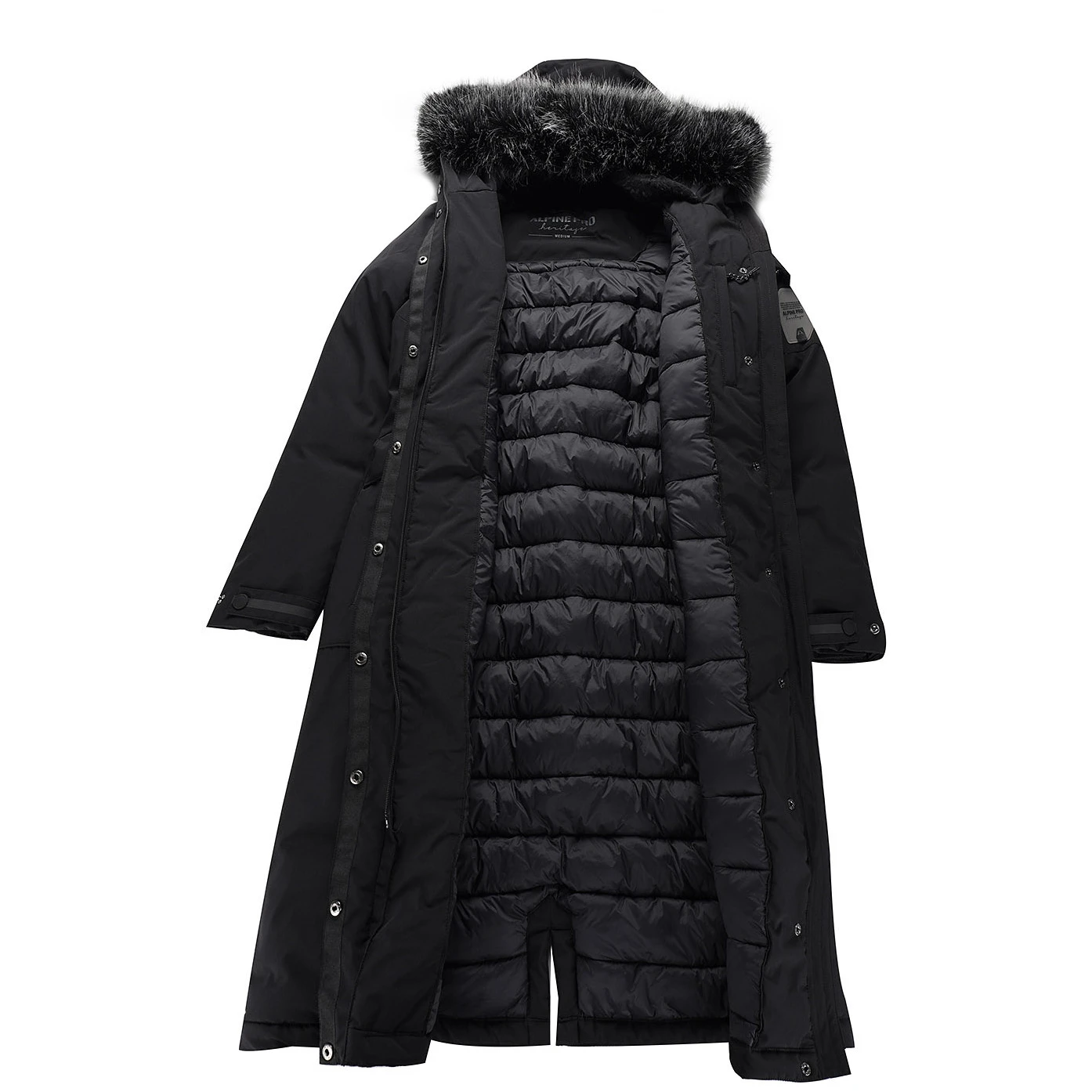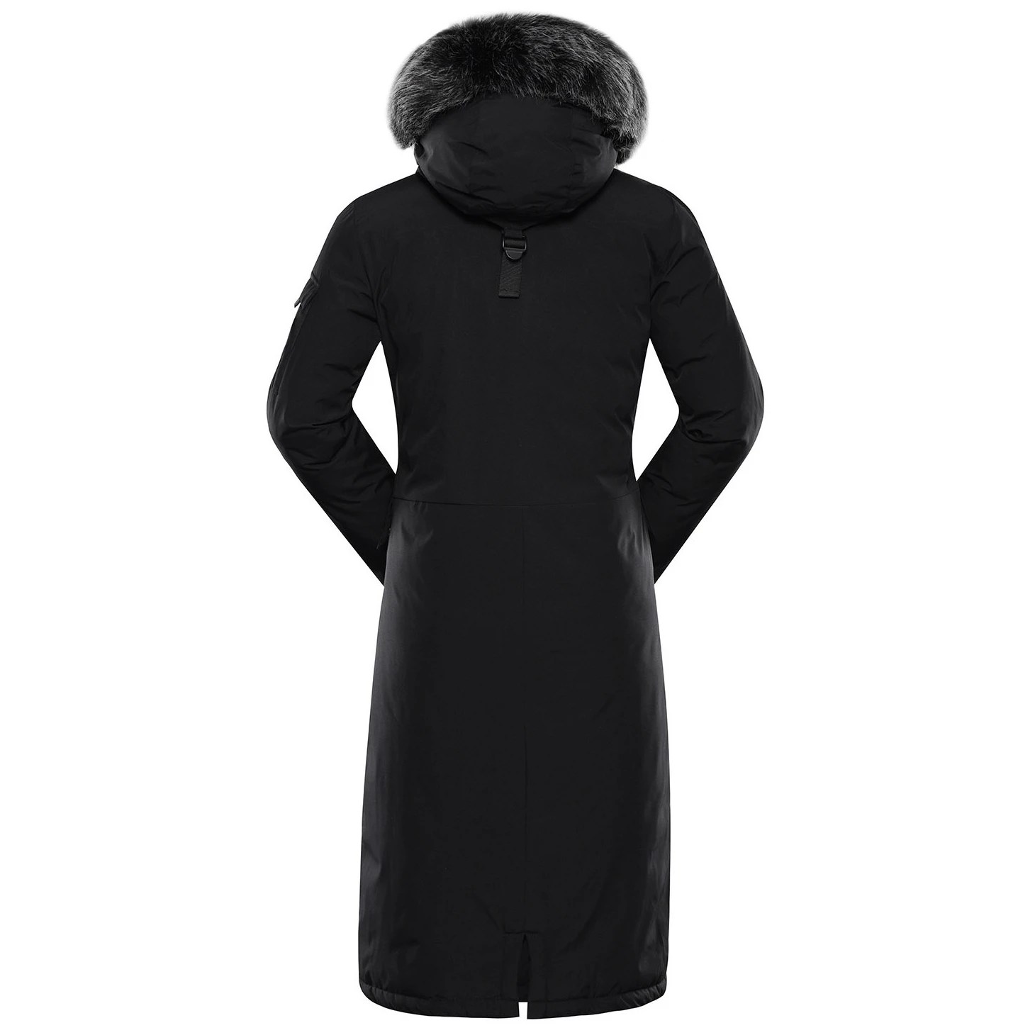 Wodoodporna, oddychająca, wiatroodporna i elastyczna tkanina wraz z mocnym, ciepłym wypełnieniem i pikowaną podszewką utrzymuje ciepło ciała nawet w niskich temperaturach. Półprzylegający krój podkreśla kobiecą sylwetkę, zapewniając jednocześnie swobodę ruchów. Nieodpinany kaptur z odpinanym futrem dodaje płaszczowi stylowego wyglądu, a wraz z ciepłym wewnętrznym kołnierzem chroni twarz i szyję przed chłodem.