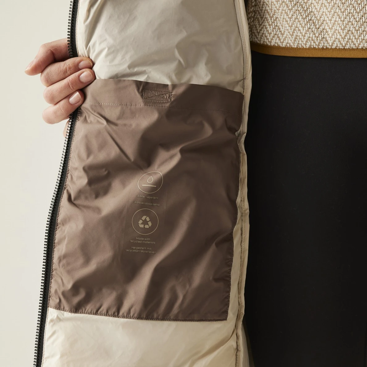 Płaszcz jest w całości wykonany z materiałów pochodzących z recyklingu, dzięki czemu oprócz niezawodnej wydajności zapewnia również dbałość o środowisko.