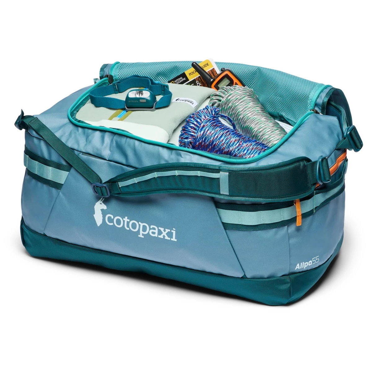 Torba podróżna Allpa Getaway 55L Duffel marki Cotopaxi zapewnia mnóstwo miejsca do przechowywania, a jednocześnie jest lekka i poręczna. Solidna konstrukcja i ekologiczne materiały z recyklingu czynią z niej niezawodnego towarzysza podróży. Wyściełane szelki pozwalają na wygodne noszenie torby na plecach, niczym plecak.