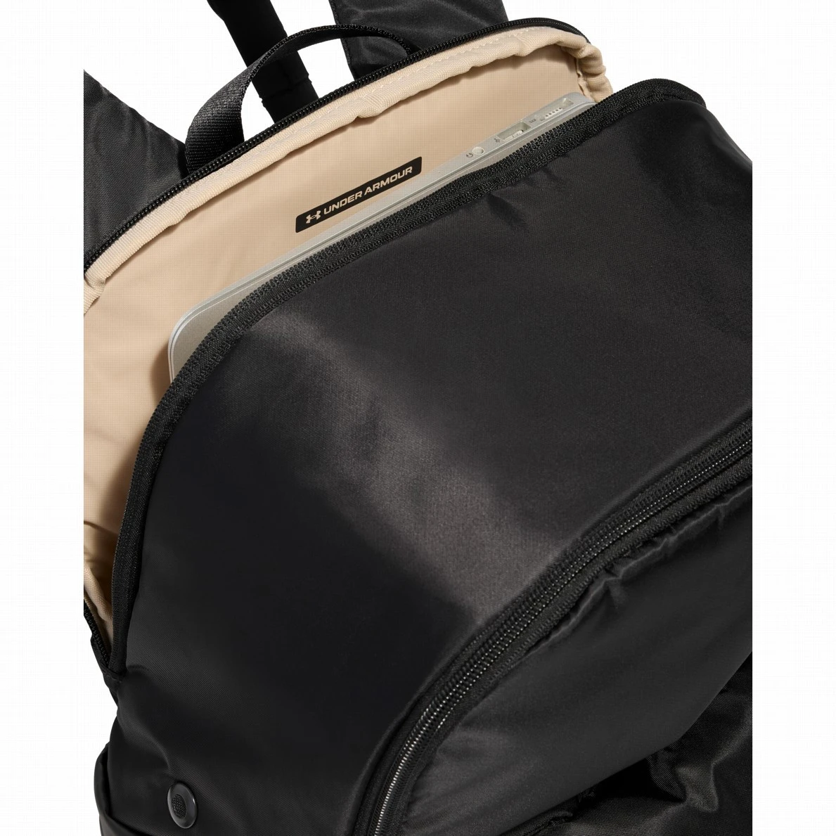 Plecak damski Studio Spirit Backpack marki Under Armour z powłoką UA Storm, dzięki której odpycha wodę i chroni Twoje rzeczy przed wilgocią. Duża komora główna, ukryta kieszeń na kosztowności i tylna kieszeń z przegrodą na laptopa o przekątnej do 16 cali.