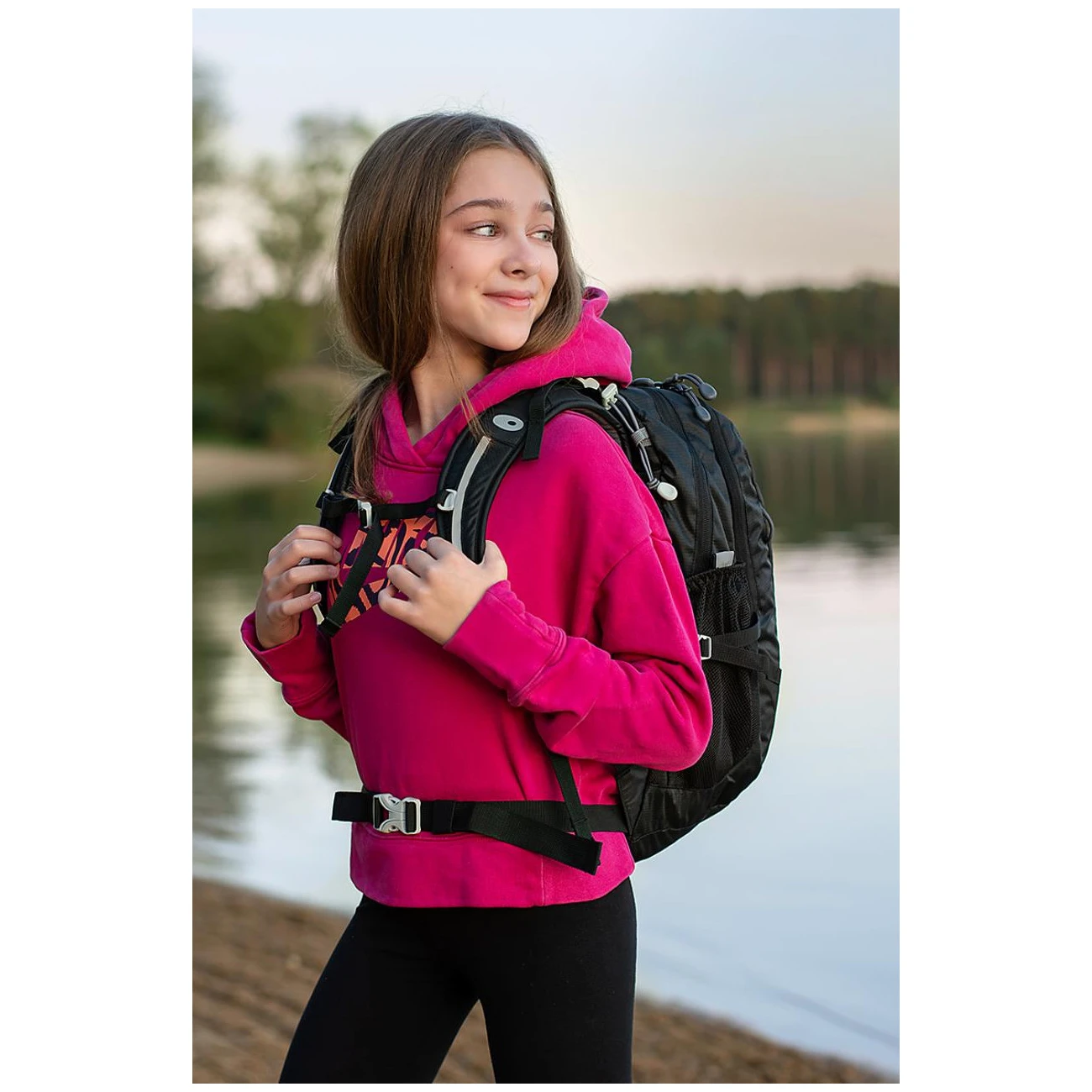 Główną zaletą jest ergonomiczny system nośny z wentylacją dopasowany do dzieci oraz stabilne ułożenie plecaka na plecach. Regulowane paski naramienne, pas piersiowy i biodrowy w tym pomagają. Wewnątrz znajdziesz główną komorę z siatkową kieszenią na zamek błyskawiczny, przednią kieszeń 3D na zamek błyskawiczny i dwie boczne siatkowe kieszenie na butelki z napojami. Oczywiście, elementy odblaskowe zwiększają widoczność dzieci przy złej pogodzie.