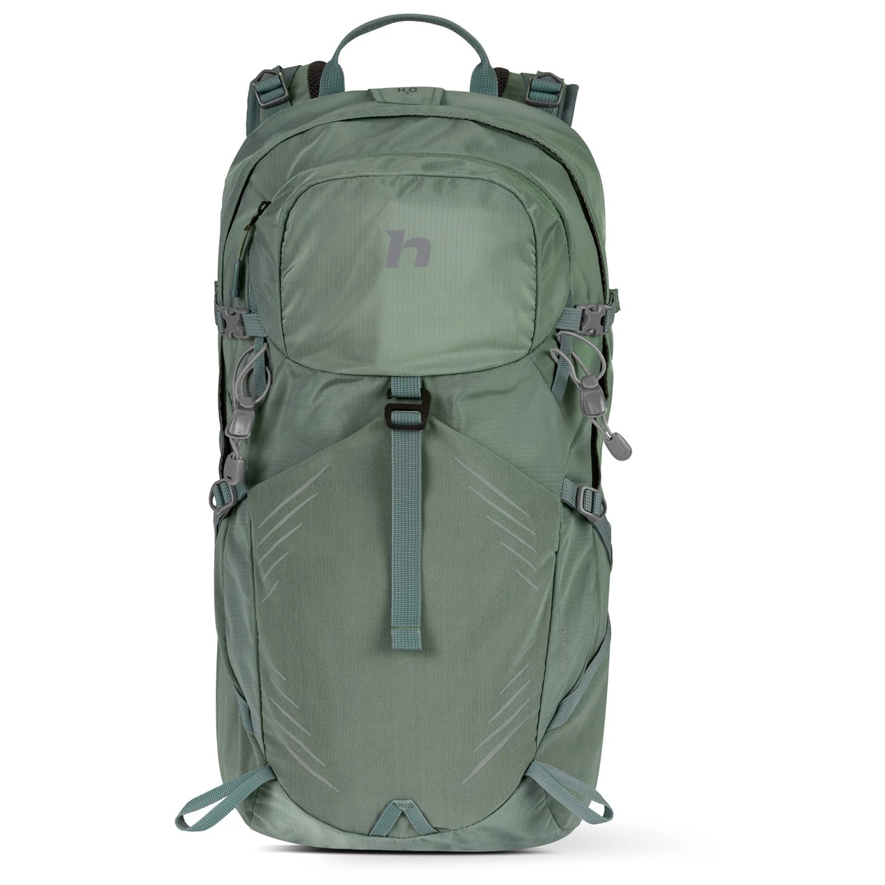 Plecak jest wyposażony w pas piersiowy z gwizdkiem dla większego bezpieczeństwa, boczne pasy kompresyjne dla lepszej stabilności ładunku oraz dwa uchwyty na kije trekkingowe. Praktyczny układ kieszeni obejmuje dwie kieszenie boczne, przednią kieszeń zapinaną na zamek, przednią kieszeń siatkową oraz kieszeń z wyjściem na bukłak na wodę. Wyposażenie obejmuje również uchwyt na lampkę sygnalizacyjną oraz zintegrowany pokrowiec przeciwdeszczowyz elementami odblaskowymi dla ochrony przed niekorzystnymi warunkami pogodowymi.
