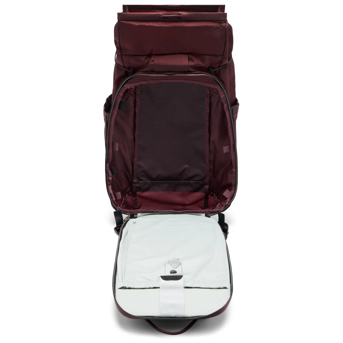 Wnętrze jest modułowe i kompatybilne z organizerami (np. Camera Cubes) – pomieści laptopa do 16″ lub bukłak 3 l. Zewnętrzne kieszenie Flex Pockets™ i system pasków Cord Hook™/Cord Rails™ umożliwiają mocowanie sprzętu na zewnątrz.