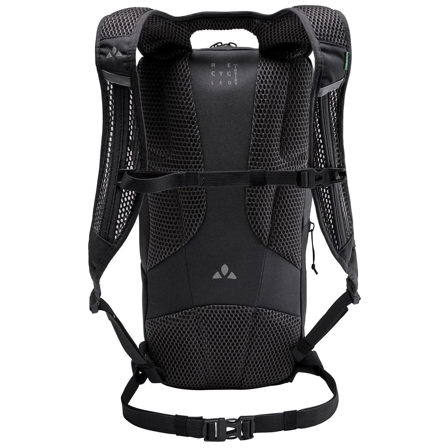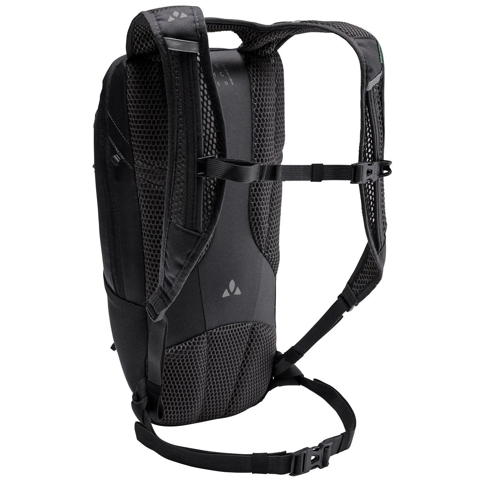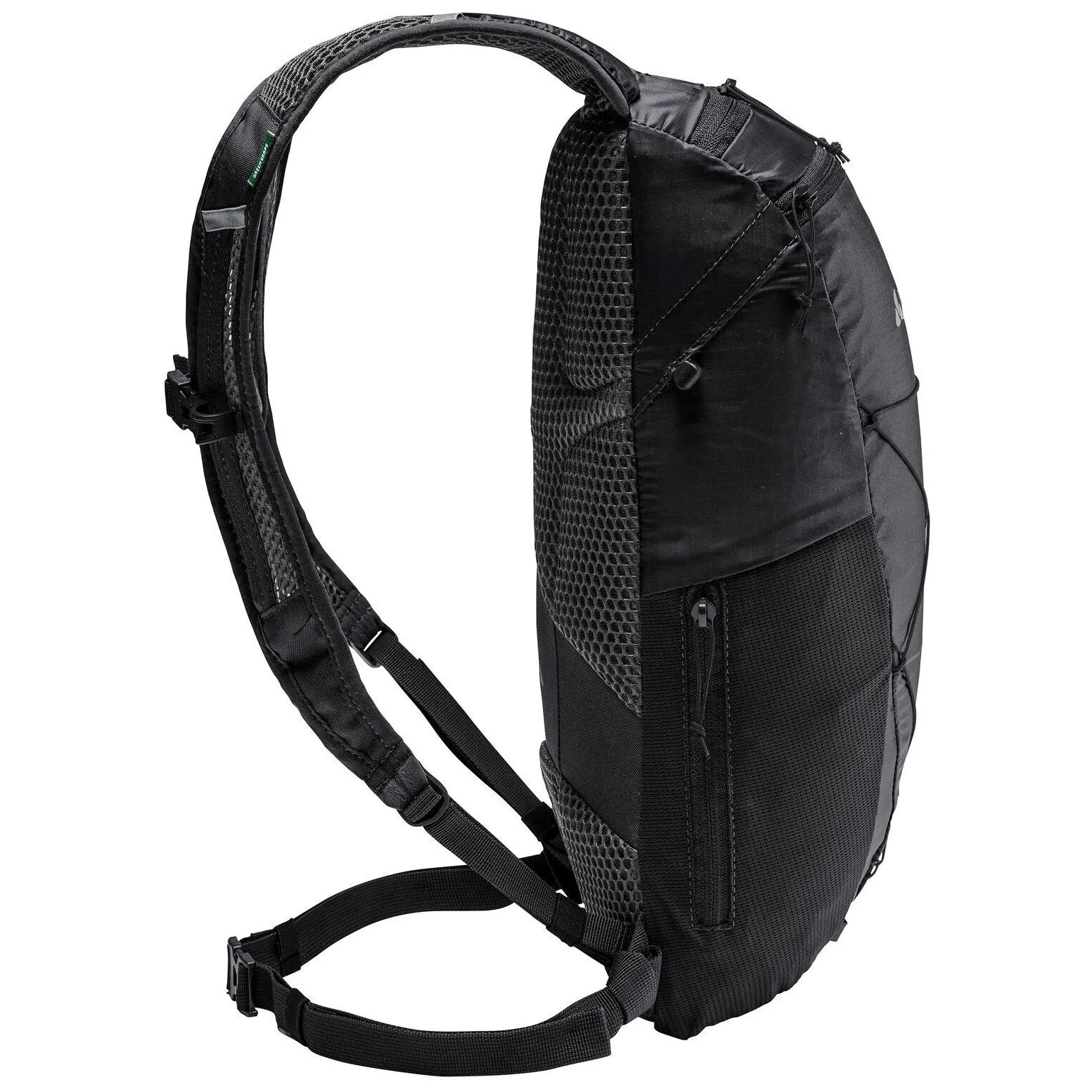 Plecak jest wykonany z dbałością o środowisko – główna silikonowana tkanina pochodzi z chemicznego recyklingu opon (bilans masowy), uzupełniona o recyklingowany poliester PET. Wykończenie Eco Finish bez PFC odpycha wodę i brud. Certyfikat VAUDE Green Shape i bluesign® gwarantuje zrównoważoną i etyczną produkcję.