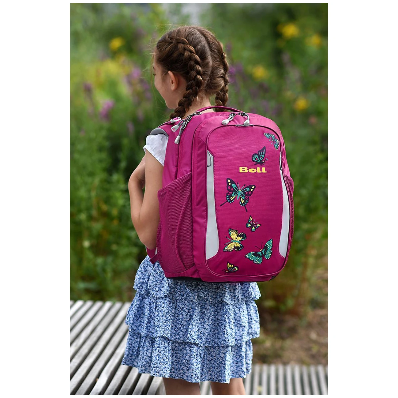 Dziecięcy plecak szkolny Boll School Mate 20 Butterflies to uniwersalny plecak dla dzieci w pierwszych klasach, od 1 do 5 klasy. Rośnie razem z dzieckiem, dzięki czemu idealnie nadaje się dla osób o wzroście w zakresie 125 - 153 cm. To dzięki w pełni regulowanemu systemowi nośnemu SP.
